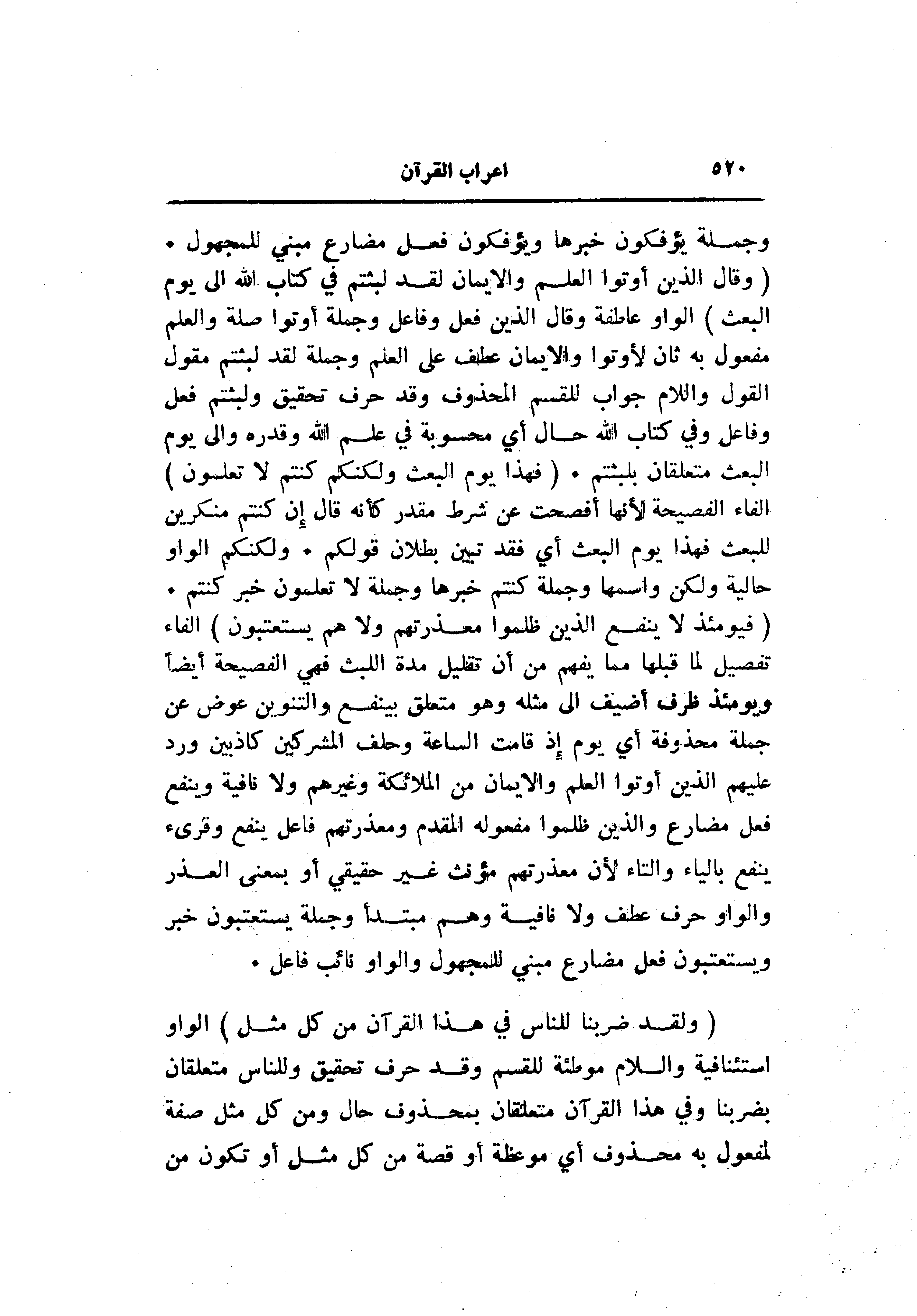 (وَقالَ الَّذِينَ أُوتُوا الْعِلْمَ وَالْإِيمانَ لَقَدْ لَبِثْتُمْ فِي كِتابِ اللَّهِ إِلى يَوْمِ الْبَعْثِ) الواو عاطفة وقال الذين فعل وفاعل وجملة أوتوا صلة والعلم مفعول به ثان لأوتوا والايمان عطف على العلم وجملة لقد لبثتم مقول القول واللام جواب للقسم المحذوف وقد حرف تحقيق ولبثتم فعل وفاعل وفي كتاب الله حال أي محسوبة في علم الله وقدره والى يوم البعث متعلقان بلبثتم. (فَهذا يَوْمُ الْبَعْثِ وَلكِنَّكُمْ كُنْتُمْ لا تَعْلَمُونَ) الفاء الفصيحة لأنها أفصحت عن شرط مقدر كأنه قال إن كنتم منكرين للبعث فهذا يوم البعث أي فقد تبين بطلان قولكم. ولكنكم الواو حالية ولكن واسمها وجملة كنتم خبرها وجملة لا تعلمون خبر كنتم.