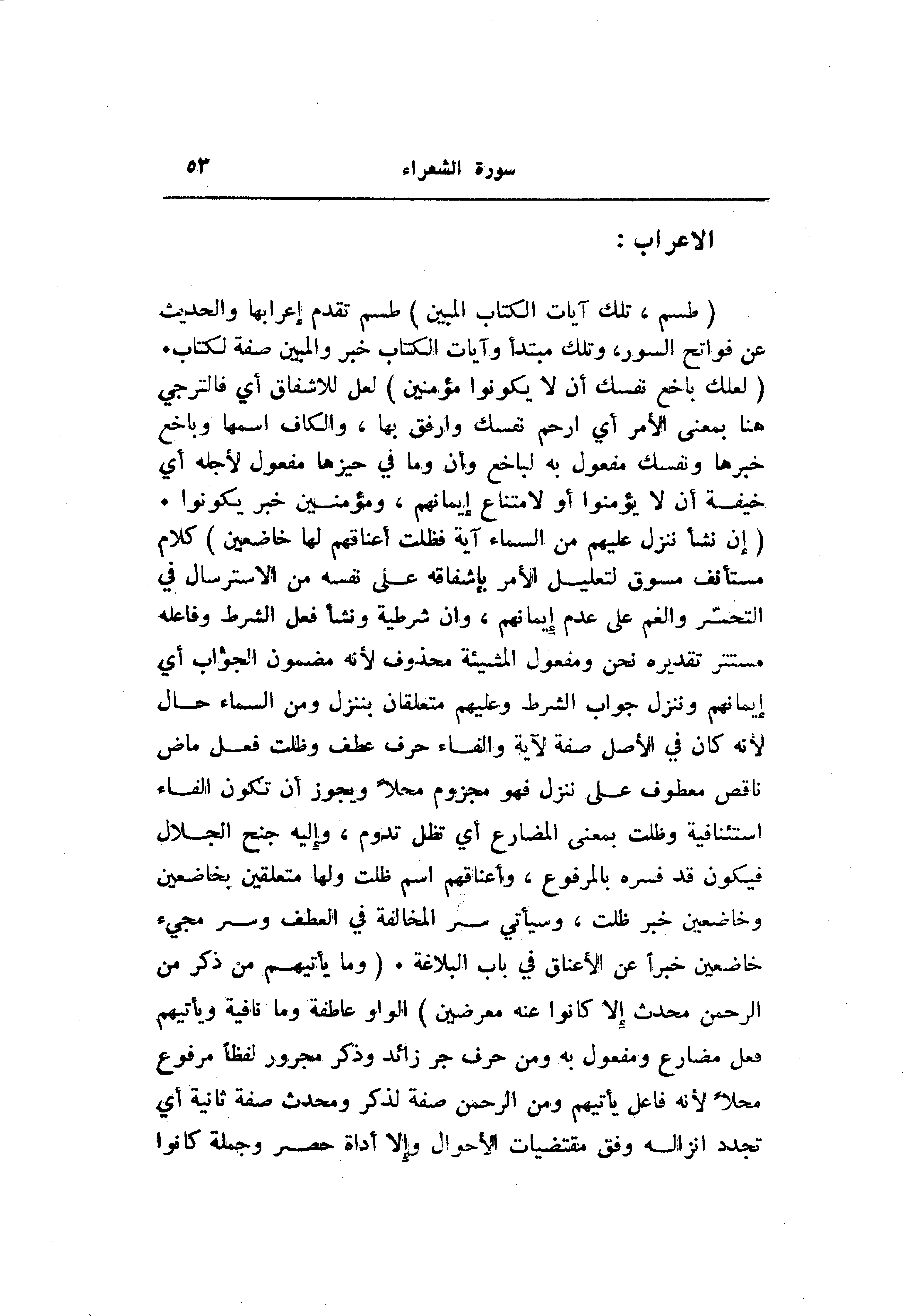 (إِنْ نَشَأْ نُنَزِّلْ عَلَيْهِمْ مِنَ السَّماءِ آيَةً فَظَلَّتْ أَعْناقُهُمْ لَها خاضِعِينَ) كلام مستأنف مسوق لتعليل الأمر بإشفاقه على نفسه من الاسترسال في التحسّر والغم على عدم إيمانهم، وان شرطية ونشأ فعل الشرط وفاعله مستتر تقديره نحن ومفعول المشيئة محذوف لأنه مضمون الجواب أي إيمانهم وننزل جواب الشرط وعليهم متعلقان بننزل ومن السماء حال لأنه كان في الأصل صفة لآية والفاء حرف عطف وظلت فعل ماض ناقص معطوف على ننزل فهو مجزوم محلا ويجوز أن تكون الفاء استئنافية وظلت بمعنى المضارع أي تظل تدوم، وإليه جنح الجلال فيكون قد فسره بالمرفوع، وأعناقهم اسم ظلت ولها متعلقين بخاضعين وخاضعين خبر ظلت، وسيأتي سر المخالفة في العطف وسر مجيء خاضعين خبرا عن الأعناق في باب البلاغة. (وَما يَأْتِيهِمْ مِنْ ذِكْرٍ مِنَ الرَّحْمنِ مُحْدَثٍ إِلَّا كانُوا عَنْهُ مُعْرِضِينَ) الواو عاطفة وما نافية ويأتيهم فعل مضارع ومفعول به ومن حرف جر زائد وذكر مجرور لفظا مرفوع محلا لأنه فاعل يأتيهم ومن الرحمن صفة لذكر ومحدث صفة ثانية أي تجدد انزاله وفق مقتضيات الأحوال وإلا أداة حصر وجملة كانوا