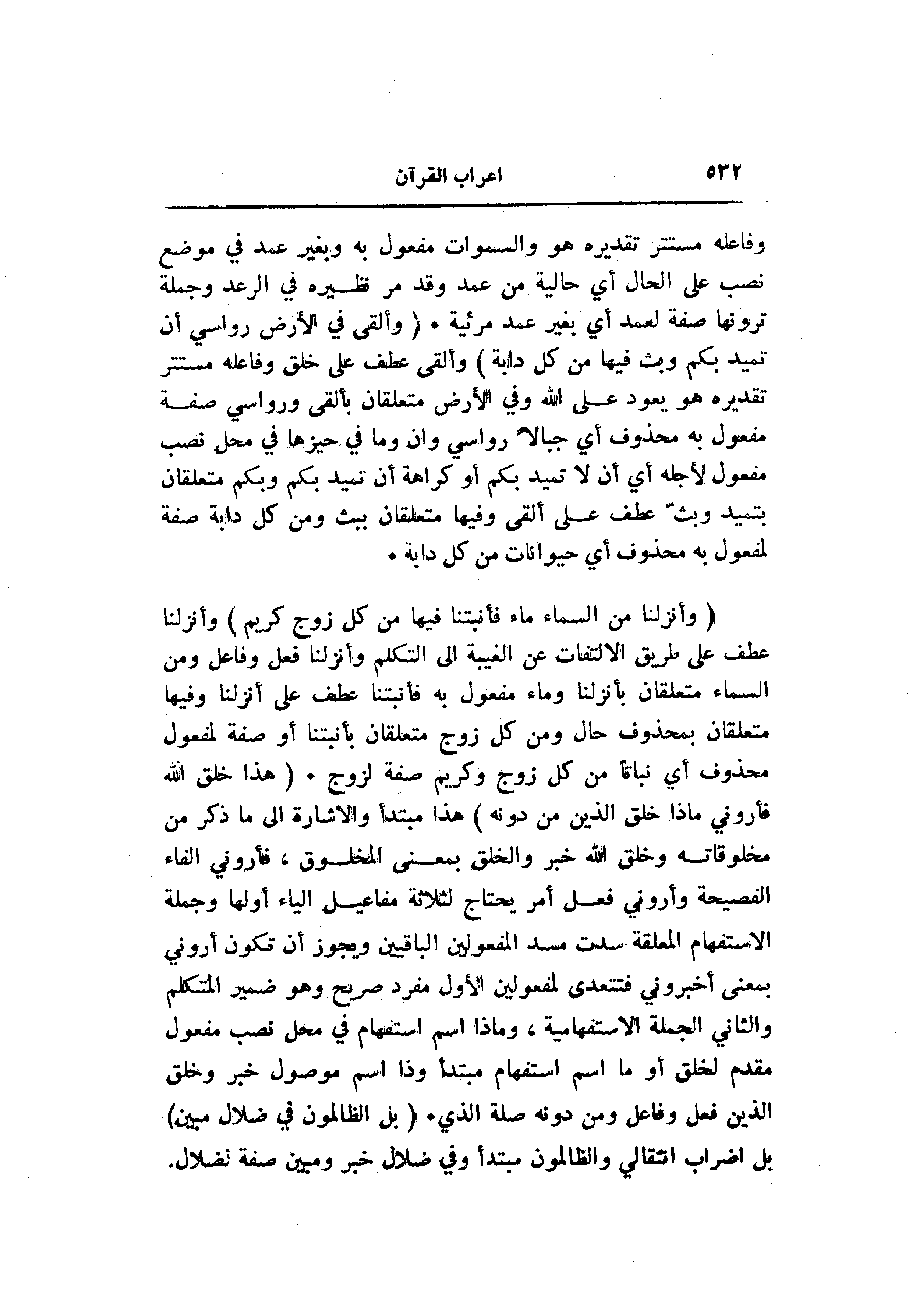 (وَأَنْزَلْنا مِنَ السَّماءِ ماءً فَأَنْبَتْنا فِيها مِنْ كُلِّ زَوْجٍ كَرِيمٍ) وأنزلنا عطف على طريق الالتفات عن الغيبة الى التكلم وأنزلنا فعل وفاعل ومن السماء متعلقان بأنزلنا وماء مفعول به فأنبتنا عطف على أنزلنا وفيها متعلقان بمحذوف حال ومن كل زوج متعلقان بأنبتنا أو صفة لمفعول محذوف أي نباتا من كل زوج وكريم صفة لزوج. (هذا خَلْقُ اللَّهِ فَأَرُونِي ماذا خَلَقَ الَّذِينَ مِنْ دُونِهِ) هذا مبتدأ والاشارة الى ما ذكر من مخلوقاته وخلق الله خبر والخلق بمعنى المخلوق، فأروني الفاء الفصيحة وأروني فعل أمر يحتاج لثلاثة مفاعيل الياء أولها وجملة الاستفهام المعلقة سدت مسد المفعولين الباقيين ويجوز أن تكون أروني بمعنى أخبروني فتتعدى لمفعولين الأول مفرد صريح وهو ضمير المتكلم والثاني الجملة الاستفهامية، وماذا اسم استفهام في محل نصب مفعول مقدم لخلق أو ما اسم استفهام مبتدأ وذا اسم موصول خبر وخلق الذين فعل وفاعل ومن دونه صلة الذي. (بَلِ الظَّالِمُونَ فِي ضَلالٍ مُبِينٍ) بل إضراب انتقالي والظالمون مبتدأ وفي ضلال خبر ومبين صفة لضلال.