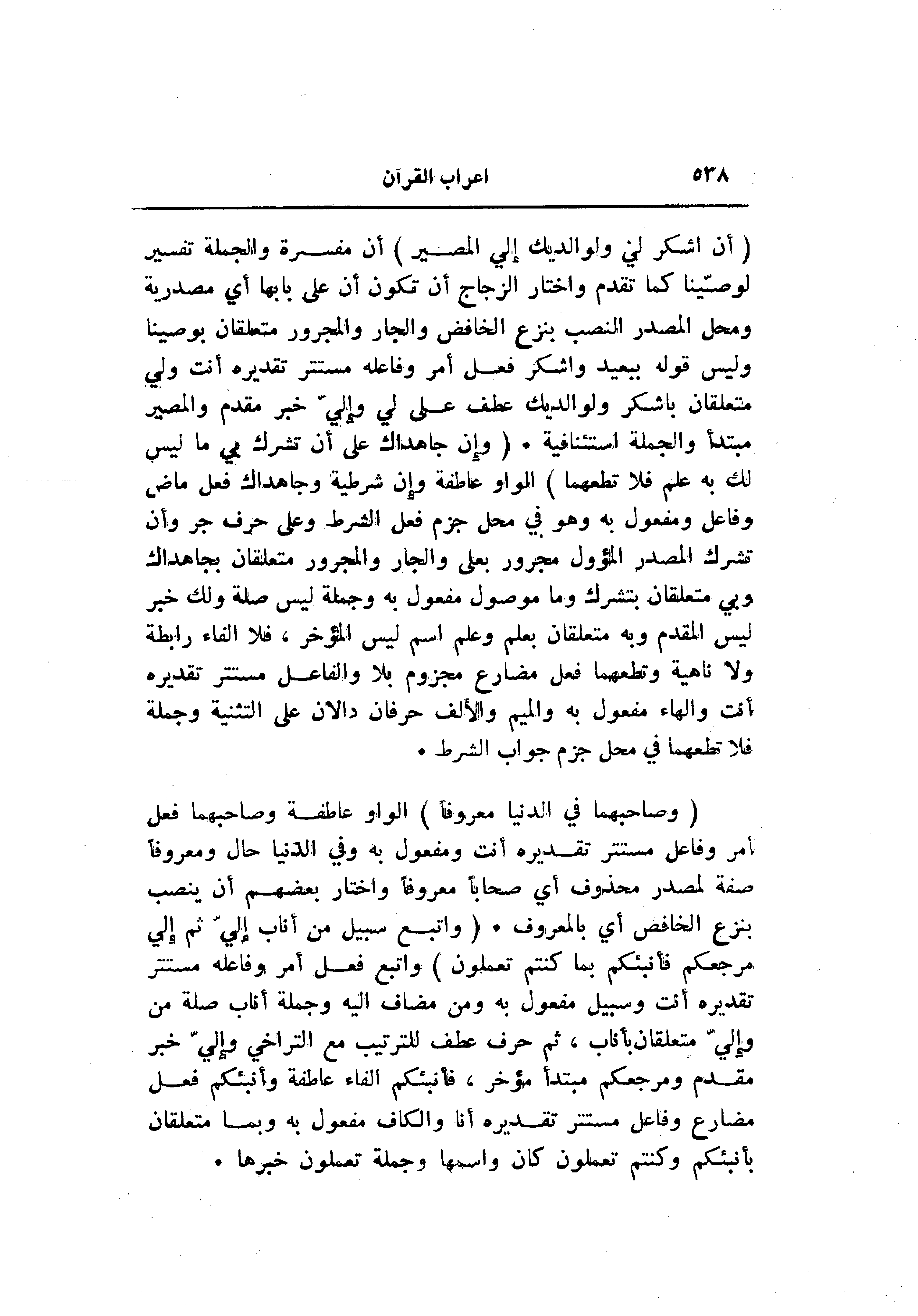 (أَنِ اشْكُرْ لِي وَلِوالِدَيْكَ إِلَيَّ الْمَصِيرُ) أن مفسرة والجملة تفسير لوصّينا كما تقدم واختار الزجاج أن تكون أن على بابها أي مصدرية ومحل المصدر النصب بنزع الخافض والجار والمجرور متعلقان بوصينا وليس قوله ببعيد واشكر فعل أمر وفاعله مستتر تقديره أنت ولي متعلقان باشكر ولوالديك عطف على لي وإليّ خبر مقدم والمصير مبتدأ والجملة استئنافية. (وَإِنْ جاهَداكَ عَلى أَنْ تُشْرِكَ بِي ما لَيْسَ لَكَ بِهِ عِلْمٌ فَلا تُطِعْهُما) الواو عاطفة وإن شرطية وجاهداك فعل ماض وفاعل ومفعول به وهو في محل جزم فعل الشرط وعلى حرف جر وأن تشرك المصدر المؤول مجرور بعلى والجار والمجرور متعلقان بجاهداك وبي متعلقان بتشرك وما موصول مفعول به وجملة ليس صلة ولك خبر ليس المقدم وبه متعلقان بعلم وعلم اسم ليس المؤخر، فلا الفاء رابطة ولا ناهية وتطعهما فعل مضارع مجزوم بلا والفاعل مستتر تقديره أنت والهاء مفعول به والميم والألف حرفان دالان على التثنية وجملة فلا تطعهما في محل جزم جواب الشرط.