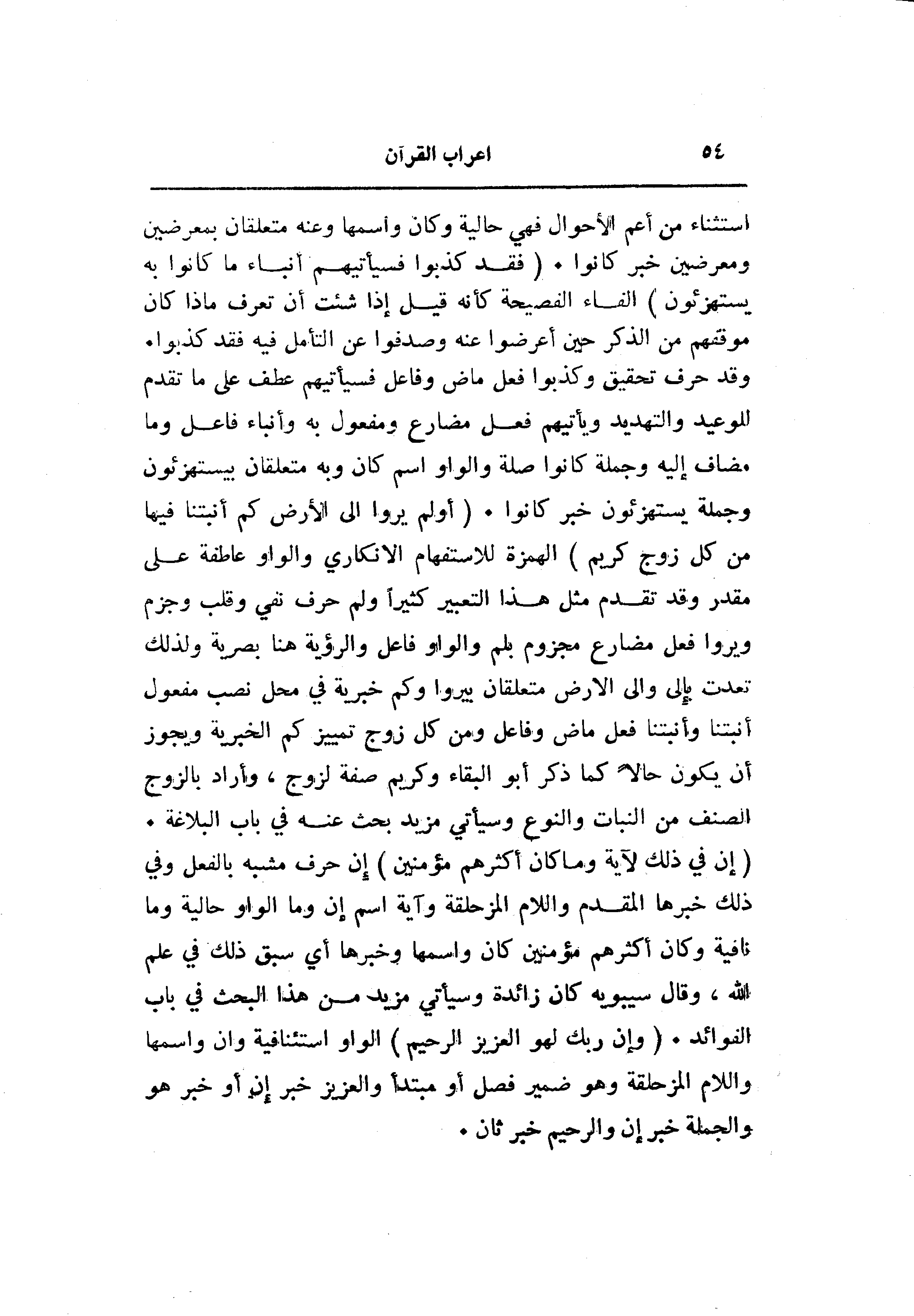 وقد حرف تحقيق وكذبوا فعل ماض وفاعل فسيأتيهم عطف على ما تقدم للوعيد والتهديد ويأتيهم فعل مضارع ومفعول به وأنباء فاعل وما مضاف إليه وجملة كانوا صلة والواو اسم كان وبه متعلقان بيستهزئون وجملة يستهزئون خبر كانوا. (أَوَلَمْ يَرَوْا إِلَى الْأَرْضِ كَمْ أَنْبَتْنا فِيها مِنْ كُلِّ زَوْجٍ كَرِيمٍ) الهمزة للاستفهام الانكاري والواو عاطفة على مقدر وقد تقدم مثل هذا التعبير كثيرا ولم حرف نفي وقلب وجزم ويروا فعل مضارع مجزوم بلم والواو فاعل والرؤية هنا بصرية ولذلك تعدت بإلى والى الأرض متعلقان بيروا وكم خبرية في محل نصب مفعول أنبتنا وأنبتنا فعل ماض وفاعل ومن كل زوج تمييز كم الخبرية ويجوز أن يكون حالا كما ذكر أبو البقاء وكريم صفة لزوج، وأراد بالزوج الصنف من النبات والنوع وسيأتي مزيد بحث عنه في باب البلاغة.