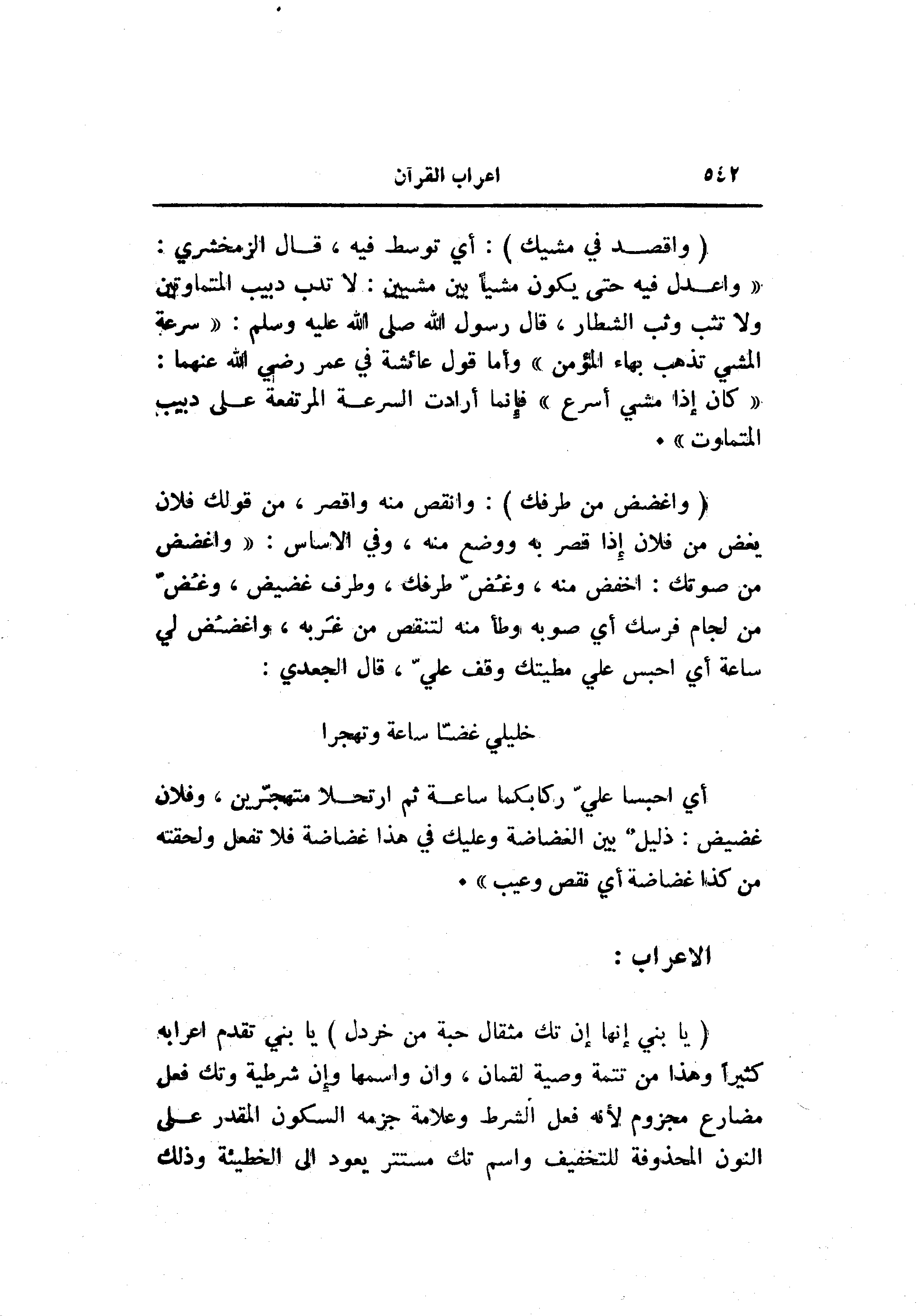 «واعدل فيه حتى يكون مشيا بين مشيين: لا تدب دبيب المتماوتين ولا تثب وثب الشطار، قال رسول الله صلى الله عليه وسلم: «سرعة المشي تذهب بهاء المؤمن» وأما قول عائشة في عمر رضي الله عنهما: