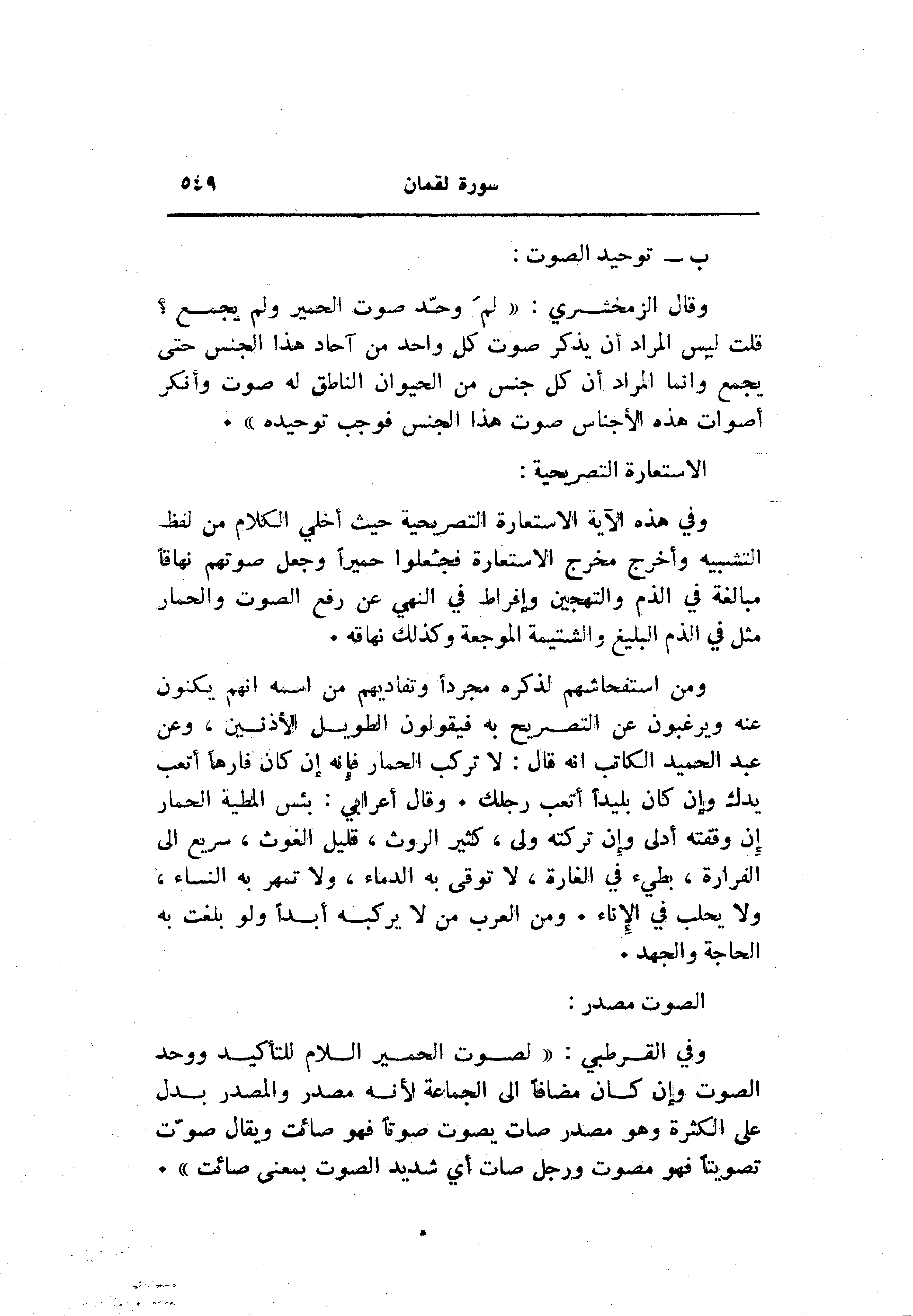 وفي القرطبي: «لصوت الحمير اللام للتأكيد ووحد الصوت وإن كان مضافا الى الجماعة لأنه مصدر والمصدر بدل على الكثرة وهو مصدر صات يصوت صوتا فهو صائت ويقال صوّت تصويتا فهو مصوت ورجل صات أي شديد الصوت بمعنى صائت» .