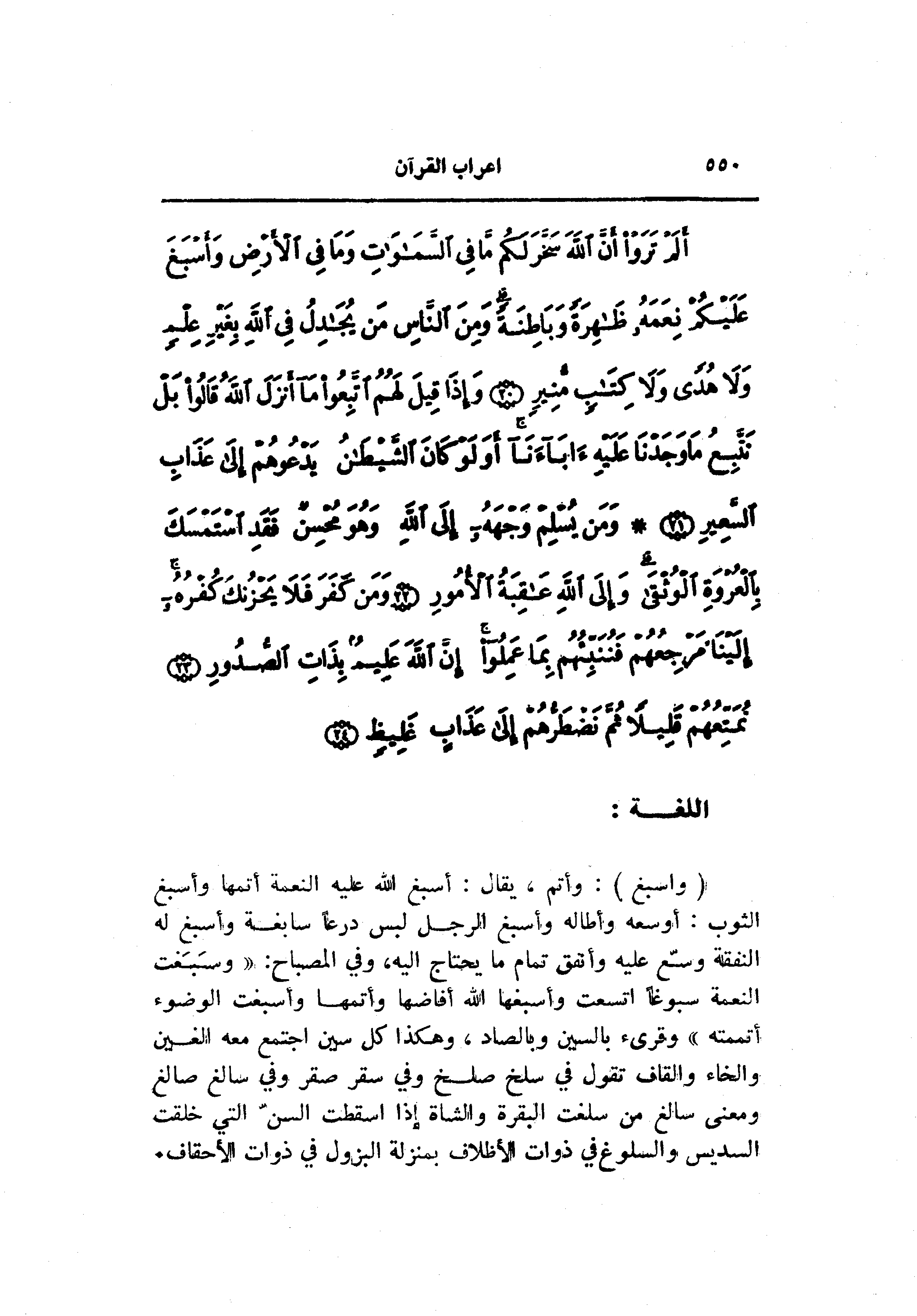 (وَأَسْبَغَ) : وأتم، يقال: أسبغ الله عليه النعمة أتمها وأسبغ الثوب: أوسعه وأطاله وأسبغ الرجل لبس درعا سابغة وأسبغ له النفقة وسّع عليه وأنفق تمام ما يحتاج اليه، وفي المصباح: «وسبغت النعمة سبوغا اتسعت وأسبغها الله أفاضها وأتمها وأسبغت الوضوء أتممته» وقرئ بالسين وبالصاد، وهكذا كل سين اجتمع معه الغين والخاء والقاف تقول في سلخ صلخ وفي سقر صقر وفي سالغ صالغ ومعنى سالغ من سلغت البقرة والشاة إذا أسقطت السنّ التي خلقت السديس والسلوغ في ذوات الأظلاف بمنزلة البزول في ذوات الأحقاف.