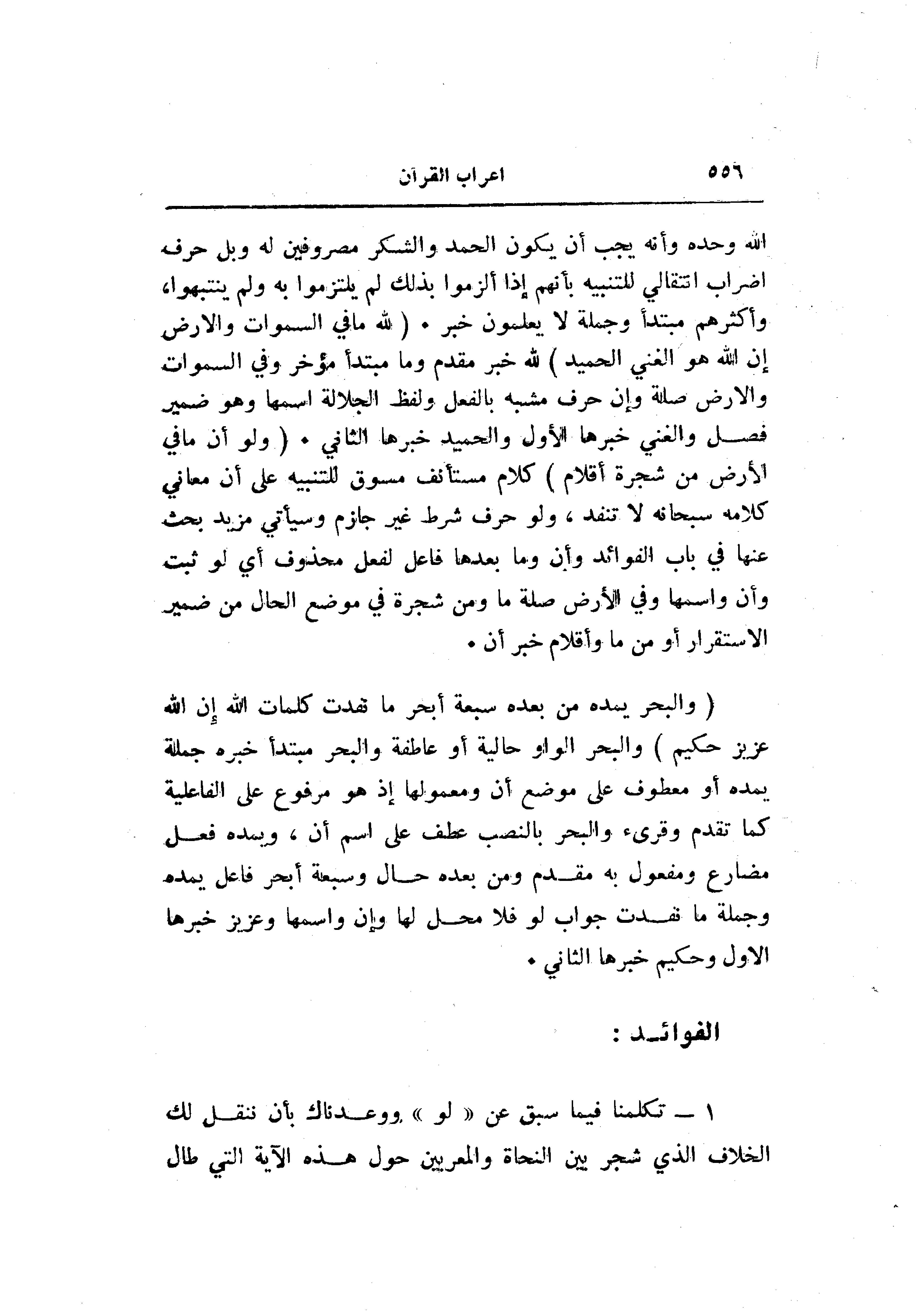 الله وحده وأنه يجب أن يكون الحمد والشكر مصروفين له وبل حرف إضراب انتقالي للتنبيه بأنهم إذا ألزموا بذلك لم يلتزموا به ولم ينتبهوا، وأكثرهم مبتدأ وجملة لا يعلمون خبر. (لِلَّهِ ما فِي السَّماواتِ وَالْأَرْضِ إِنَّ اللَّهَ هُوَ الْغَنِيُّ الْحَمِيدُ) لله خبر مقدم وما مبتدأ مؤخر وفي السموات والأرض صلة وإن حرف مشبه بالفعل ولفظ الجلالة اسمها وهو ضمير فصل والغني خبرها الأول والحميد خبرها الثاني. (وَلَوْ أَنَّما فِي الْأَرْضِ مِنْ شَجَرَةٍ أَقْلامٌ) كلام مستأنف مسوق للتنبيه على أن معاني كلامه سبحانه لا تنفد، ولو حرف شرط غير جازم وسيأتي مزيد بحث عنها في باب الفوائد وأن وما بعدها فاعل لفعل محذوف أي لو ثبت وأن واسمها وفي الأرض صلة ما ومن شجرة في موضع الحال من ضمير الاستقرار أو من ما وأقلام خبر أن.