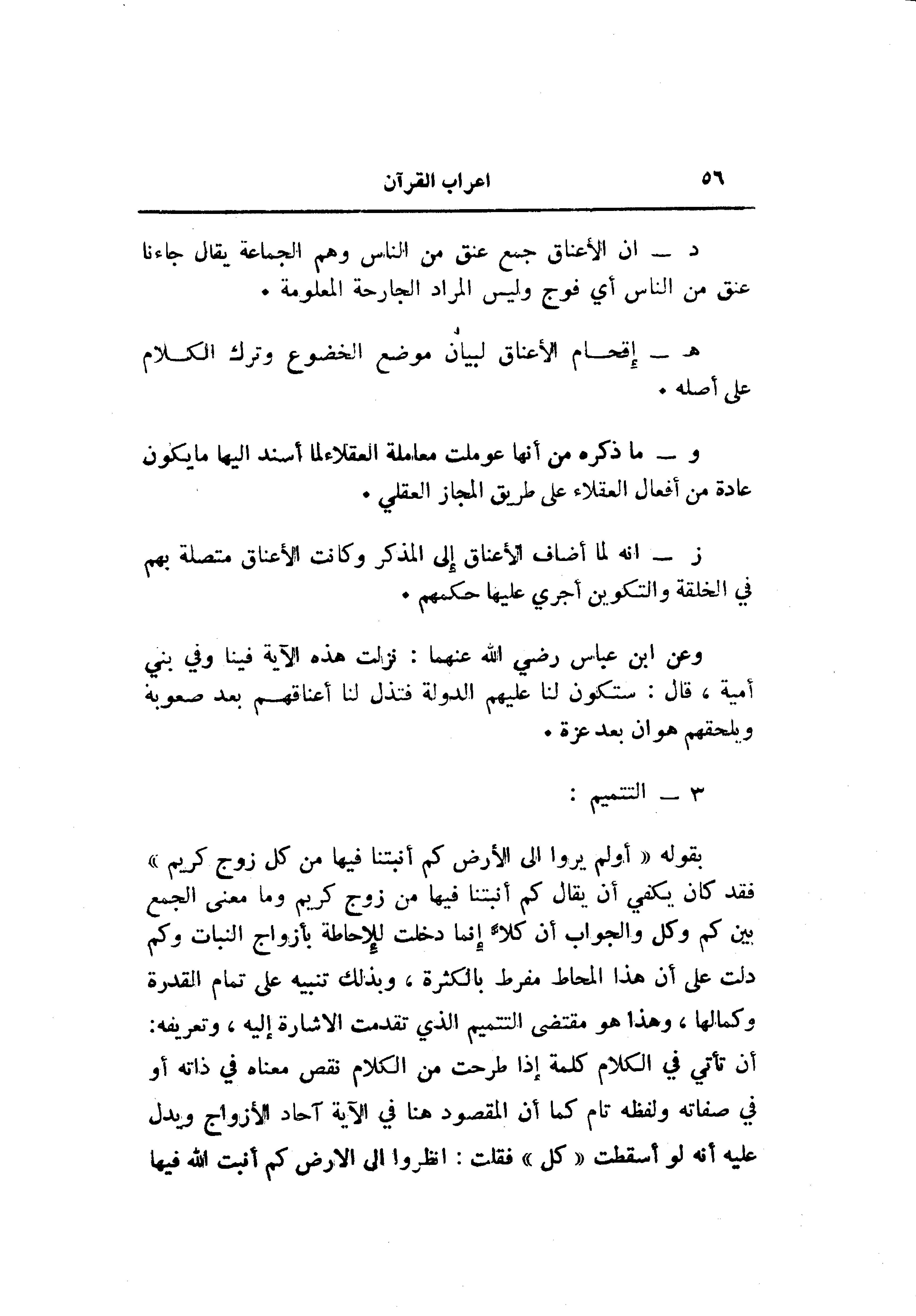 بقوله «أولم يروا الى الأرض كم أنبتنا فيها من كل زوج كريم» فقد كان يكفي أن يقال كم أنبتنا فيها من زوج كريم وما معنى الجمع بين كم وكل والجواب أن كلّا إنما دخلت للإحاطة بأزواج النبات وكم دلت على أن هذا المحاط مفرط بالكثرة، وبذلك تنبيه على تمام القدرة وكمالها، وهذا هو مقتضى التتميم الذي تقدمت الاشارة إليه، وتعريفه: