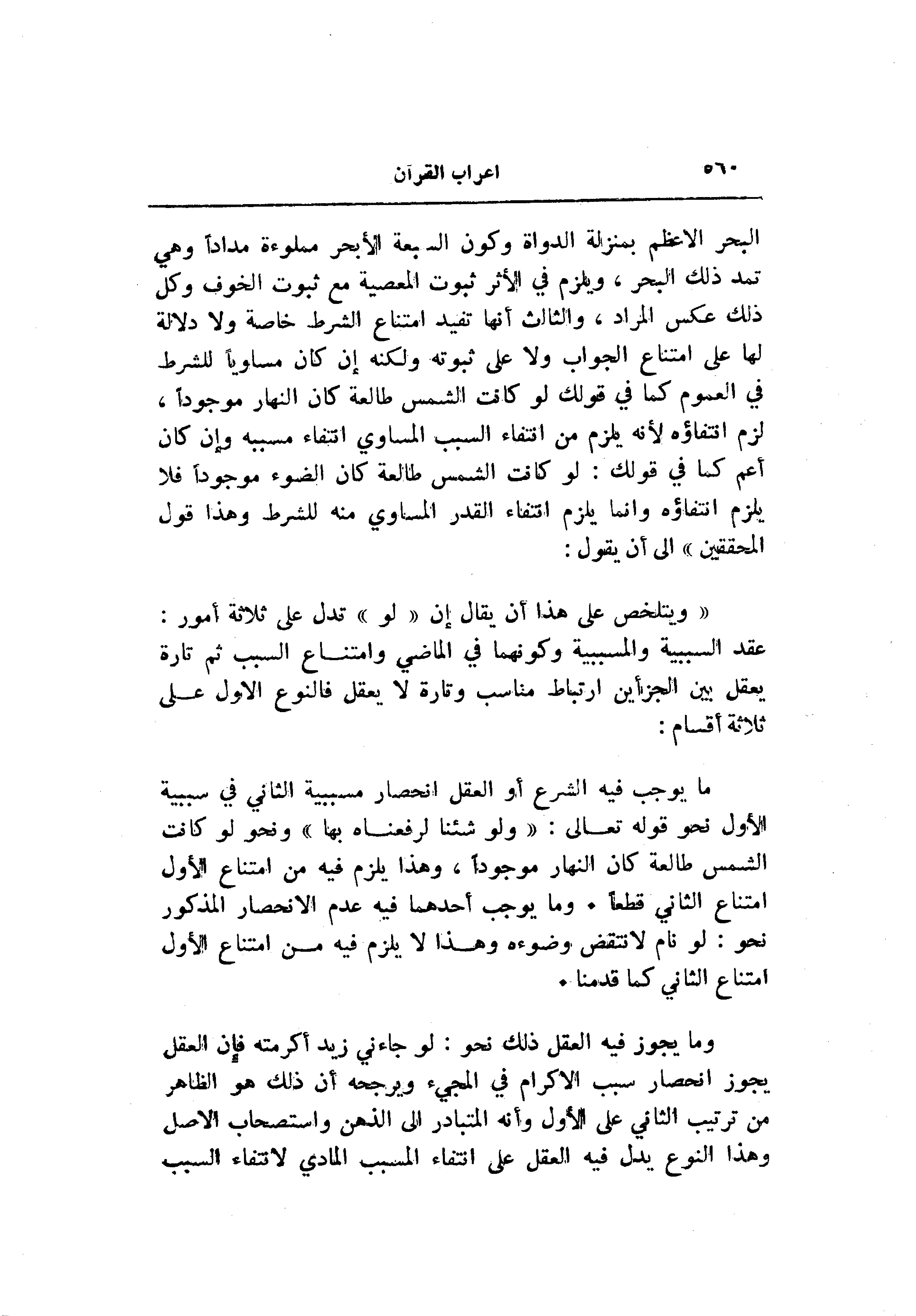البحر الأعظم بمنزلة الدواة وكون السبعة الأبحر مملوءة مدادا وهي تمد ذلك البحر، ويلزم في الأثر ثبوت المعصية مع ثبوت الخوف وكل ذلك عكس المراد، والثالث أنها تفيد امتناع الشرط خاصة ولا دلالة لها على امتناع الجواب ولا على ثبوته ولكنه إن كان مساويا للشرط في العموم كما في قولك لو كانت الشمس طالعة كان النهار موجودا، لزم انتفاؤه لأنه يلزم من انتفاء السبب المساوي انتفاء مسببه وإن كان أعم كما في قولك: لو كانت الشمس طالعة كان الضوء موجودا فلا يلزم انتفاؤه وانما يلزم انتفاء القدر المساوي منه للشرط وهذا قول المحققين» الى أن يقول: