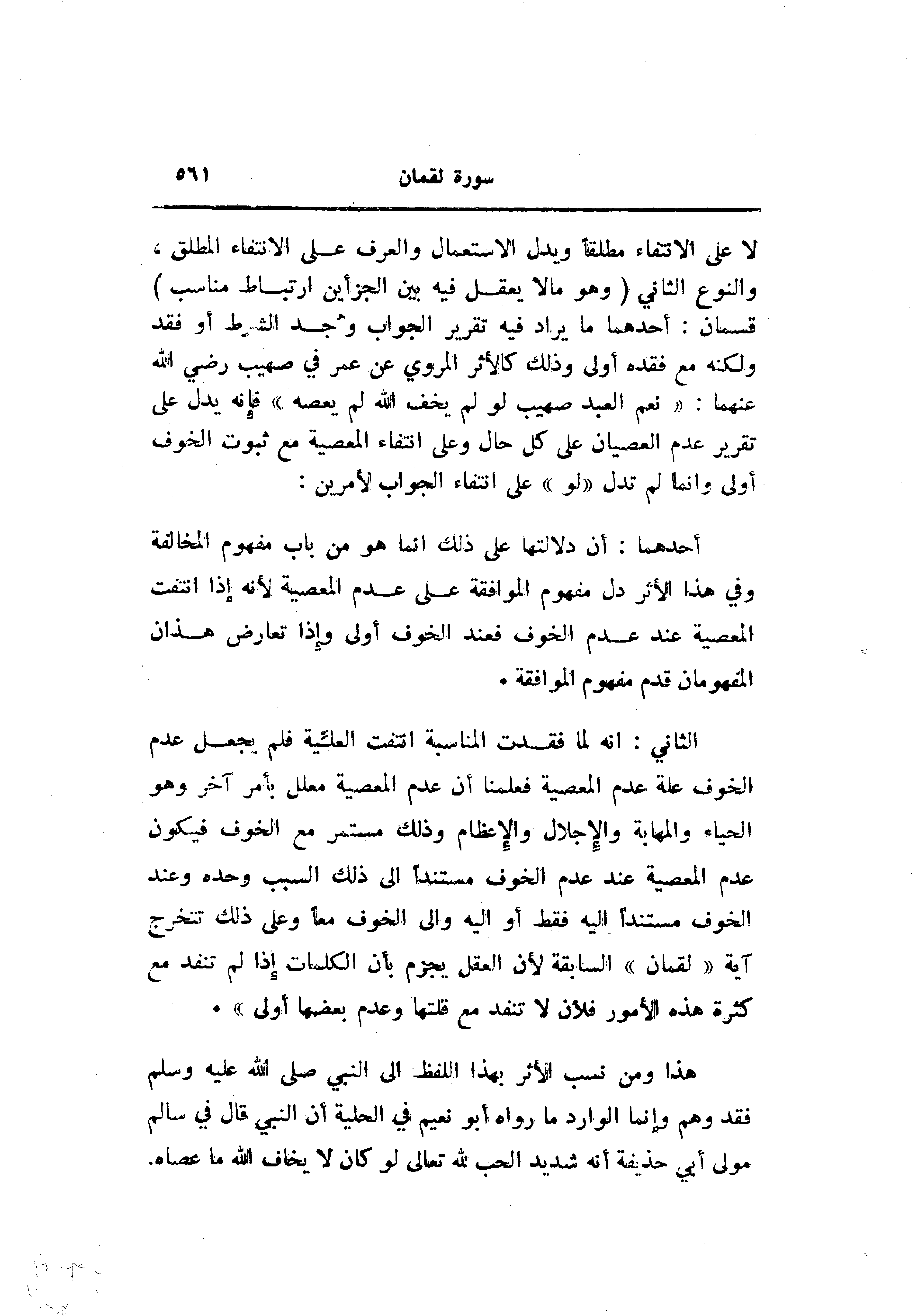 الثاني: انه لما فقدت المناسبة انتفت العلّية فلم يجعل عدم الخوف علة عدم المعصية فعلمنا أن عدم المعصية معلل بأمر آخر وهو الحياء والمهابة والإجلال والإعظام وذلك مستمر مع الخوف فيكون عدم المعصية عند عدم الخوف مستندا الى ذلك السبب وحده وعند الخوف مستندا اليه فقط أو اليه والى الخوف معا وعلى ذلك تتخرج آية «لقمان» السابقة لأن العقل يجزم بأن الكلمات إذا لم تنفد مع كثرة هذه الأمور فلأن لا تنفد مع قلتها وعدم بعضها أولى» .