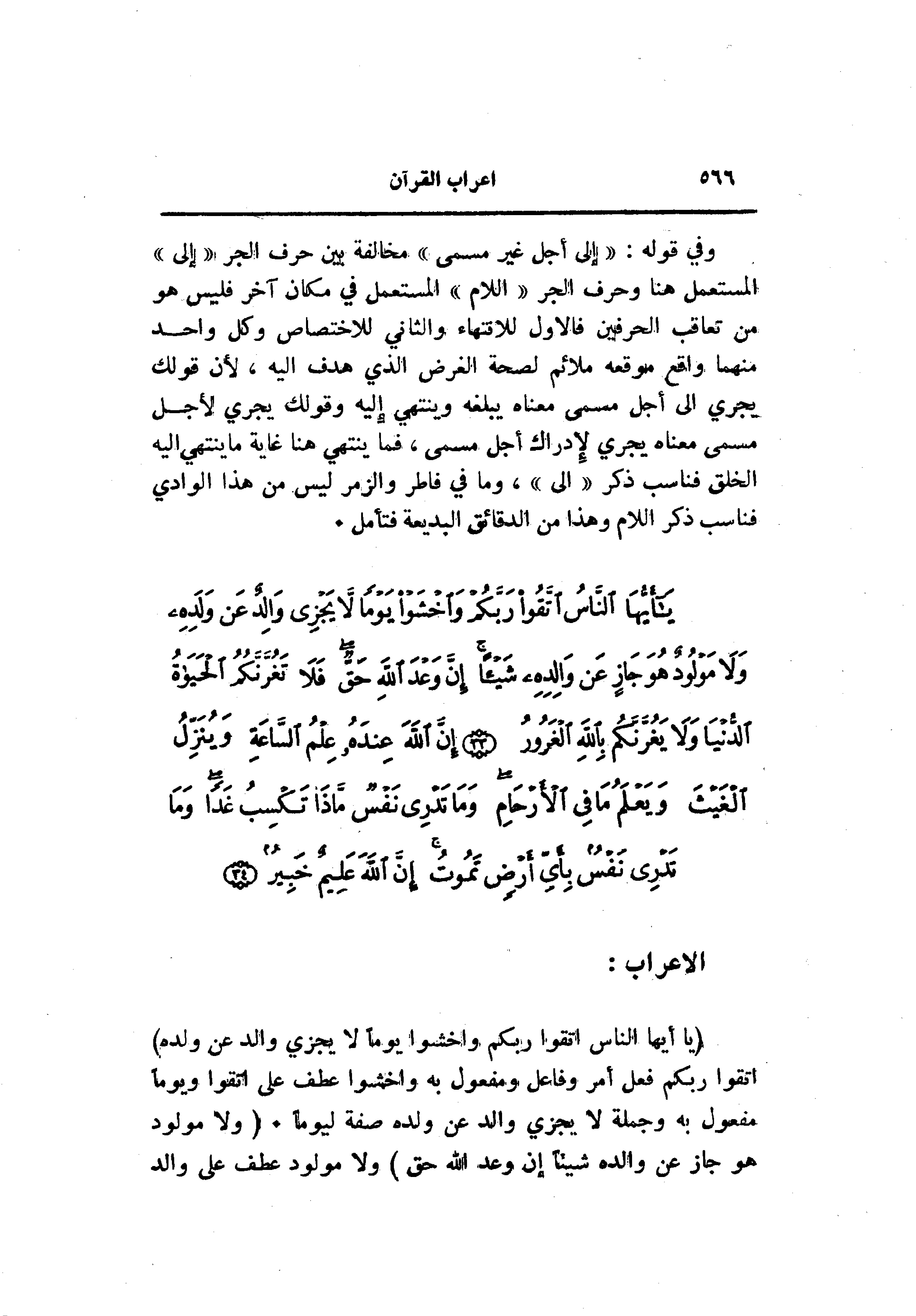 وفي قوله: «إلى أجل غير مسمى» مخالفة بين حرف الجر «إلى» المستعمل هنا وحرف الجر «اللام» المستعمل في مكان آخر فليس هو من تعاقب الحرفين فالاول للانتهاء والثاني للاختصاص وكل واحد منهما واقع موقعه ملائم لصحة الغرض الذي هدف اليه، لأن قولك يجري الى أجل مسمى معناه يبلغه وينتهي إليه وقولك يجري لأجل مسمى معناه يجري لإدراك أجل مسمى، فما ينتهي هنا غاية ما ينتهي اليه الخلق فناسب ذكر «الى» ، وما في فاطر والزمر ليس من هذا الوادي فناسب ذكر اللام وهذا من الدقائق البديعة فتأمل.