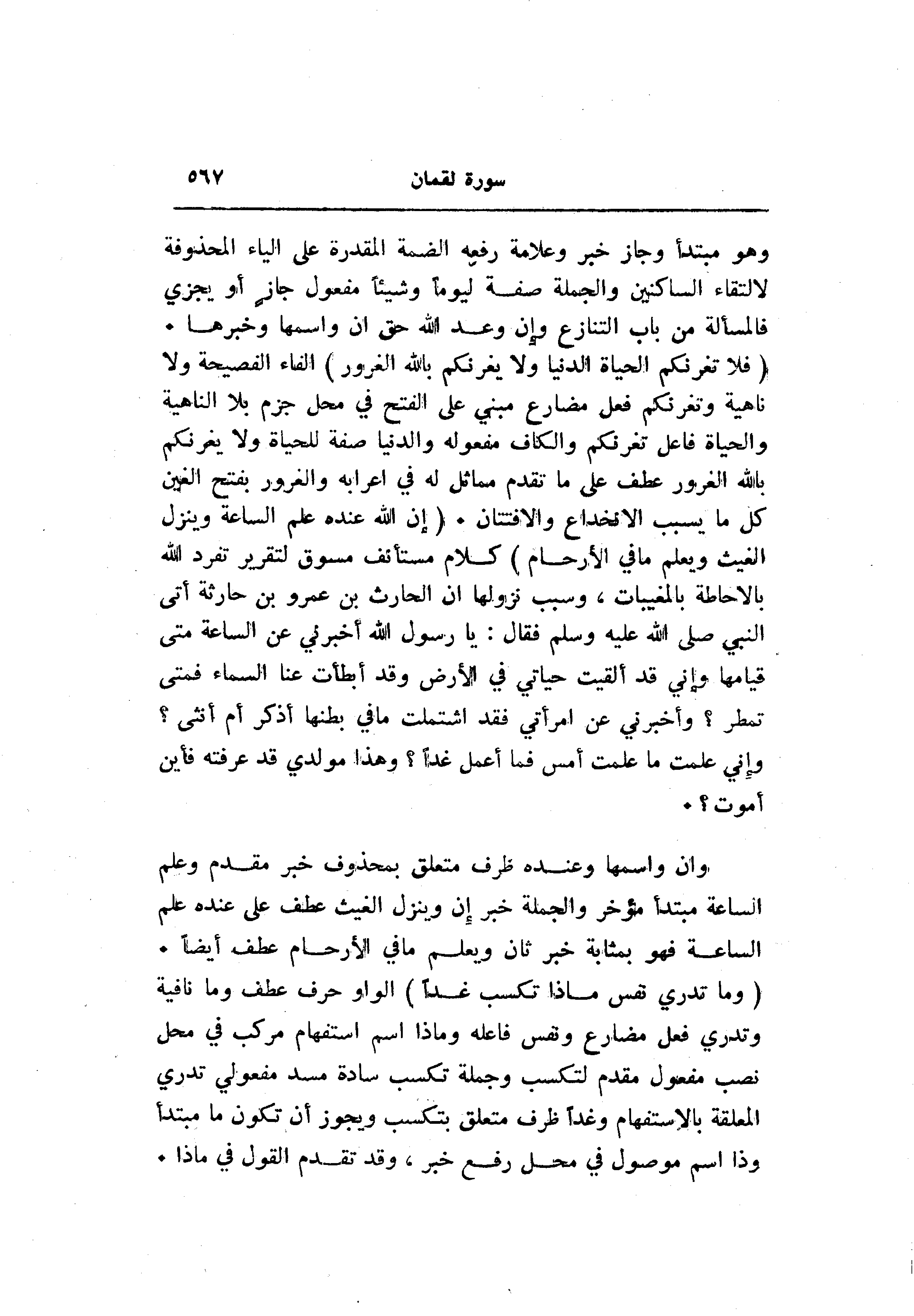 (فَلا تَغُرَّنَّكُمُ الْحَياةُ الدُّنْيا وَلا يَغُرَّنَّكُمْ بِاللَّهِ الْغَرُورُ) الفاء الفصيحة ولا ناهية وتغرنكم فعل مضارع مبني على الفتح في محل جزم بلا الناهية والحياة فاعل تغرنكم والكاف مفعوله والدنيا صفة للحياة ولا يغرنكم بالله الغرور عطف على ما تقدم مماثل له في إعرابه والغرور بفتح الغين كل ما يسبب الانخداع والافتتان. (إِنَّ اللَّهَ عِنْدَهُ عِلْمُ السَّاعَةِ وَيُنَزِّلُ الْغَيْثَ وَيَعْلَمُ ما فِي الْأَرْحامِ) كلام مستأنف مسوق لتقرير تفرد الله بالاحاطة بالمغيبات، وسبب نزولها ان الحارث بن عمرو بن حارثة أتى النبي صلى الله عليه وسلم فقال: يا رسول الله أخبرني عن الساعة متى قيامها وإني قد ألقيت حياتي في الأرض وقد أبطأت عنا السماء فمتى تمطر؟ وأخبرني عن امرأتي فقد اشتملت ما في بطنها أذكر أم أنثى؟