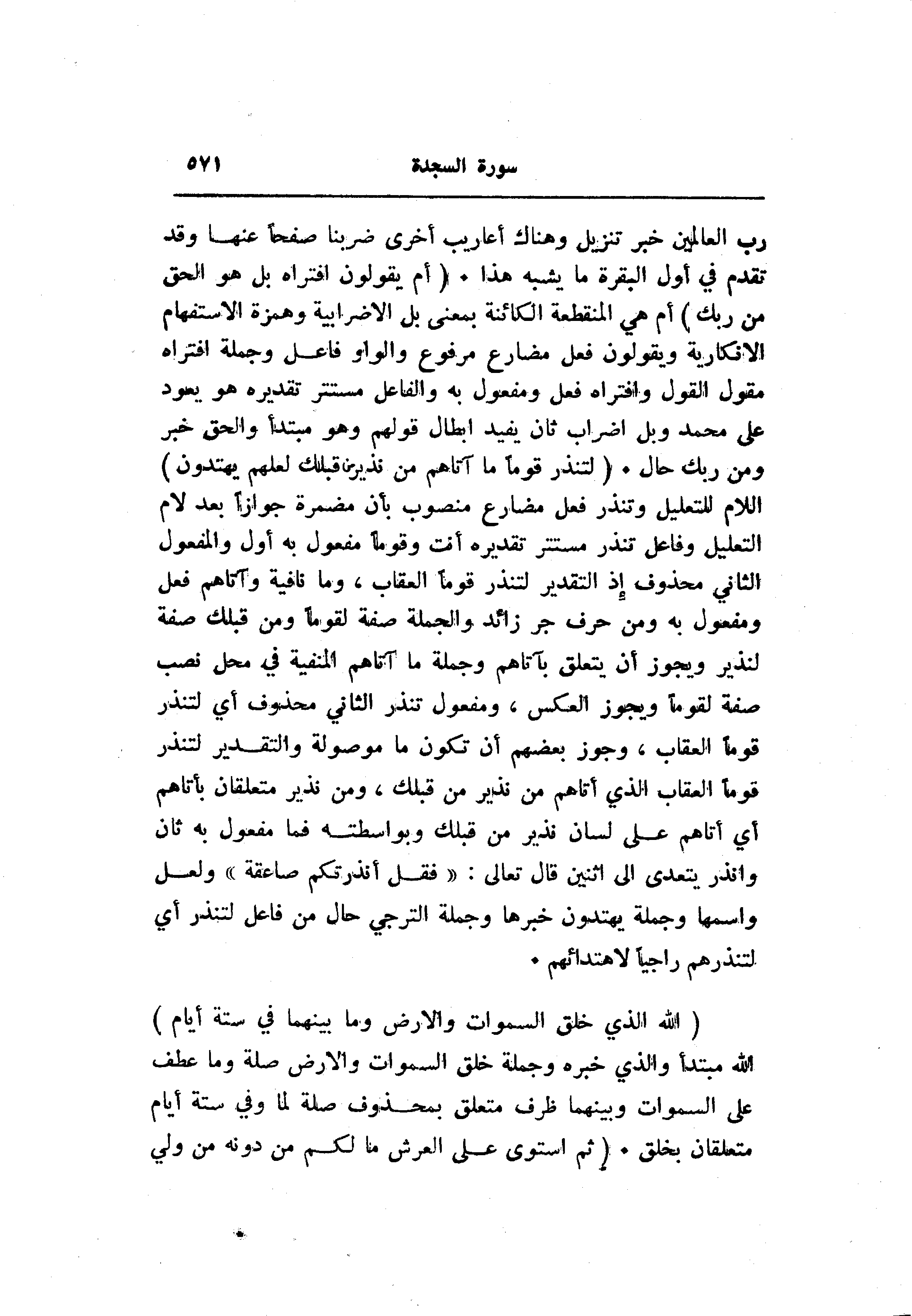 رب العالمين خبر تنزيل وهناك أعاريب أخرى ضربنا صفحا عنها وقد تقدم في أول البقرة ما يشبه هذا. (أَمْ يَقُولُونَ افْتَراهُ بَلْ هُوَ الْحَقُّ مِنْ رَبِّكَ) أم هي المنقطعة الكائنة بمعنى بل الاضرابية وهمزة الاستفهام الانكارية ويقولون فعل مضارع مرفوع والواو فاعل وجملة افتراه مقول القول وافتراه فعل ومفعول به والفاعل مستتر تقدير هو يعود على محمد وبل إضراب ثان يفيد ابطال قولهم وهو مبتدأ ولحق خبر ومن ربك حال. (لِتُنْذِرَ قَوْماً ما أَتاهُمْ مِنْ نَذِيرٍ مِنْ قَبْلِكَ لَعَلَّهُمْ يَهْتَدُونَ) اللام للتعليل وتنذر فعل مضارع منصوب بأن مضمرة جوان بعد لام التعليل وفاعل تنذر مستتر تقديره أنت وقوما مفعول به أول والمفعول الثاني محذوف إذ التقدير لتنذر قوما العقاب، وما نافية وآتاهم فعل ومفعول به ومن حرف جر زائد والجملة صفة لقوما ومن قبلك صفة لنذير ويجوز أن يتعلق بآتاهم وجملة ما آتاهم المنفية في محل نصب صفة لقوما ويجوز العكس، ومفعول تنذر الثاني محذوف أي لتنذر قوما العقاب، وجوز بعضهم أن تكون ما موصولة والتقدير لتنذر قوما العقاب الذي أتاهم من نذير من قبلك، ومن نذير متعلقان بأتاهم أي أتاهم على لسان نذير من قبلك وبواسطته فما مفعول به ثان وانذر يتعدى الى اثنين قال تعالى: «فقل أنذرتكم صاعقة» ولعل واسمها وجملة يهتدون خبرها وجملة الترجي حال من فاعل لتنذر أي لتنذرهم راجيا لاهتدائهم.