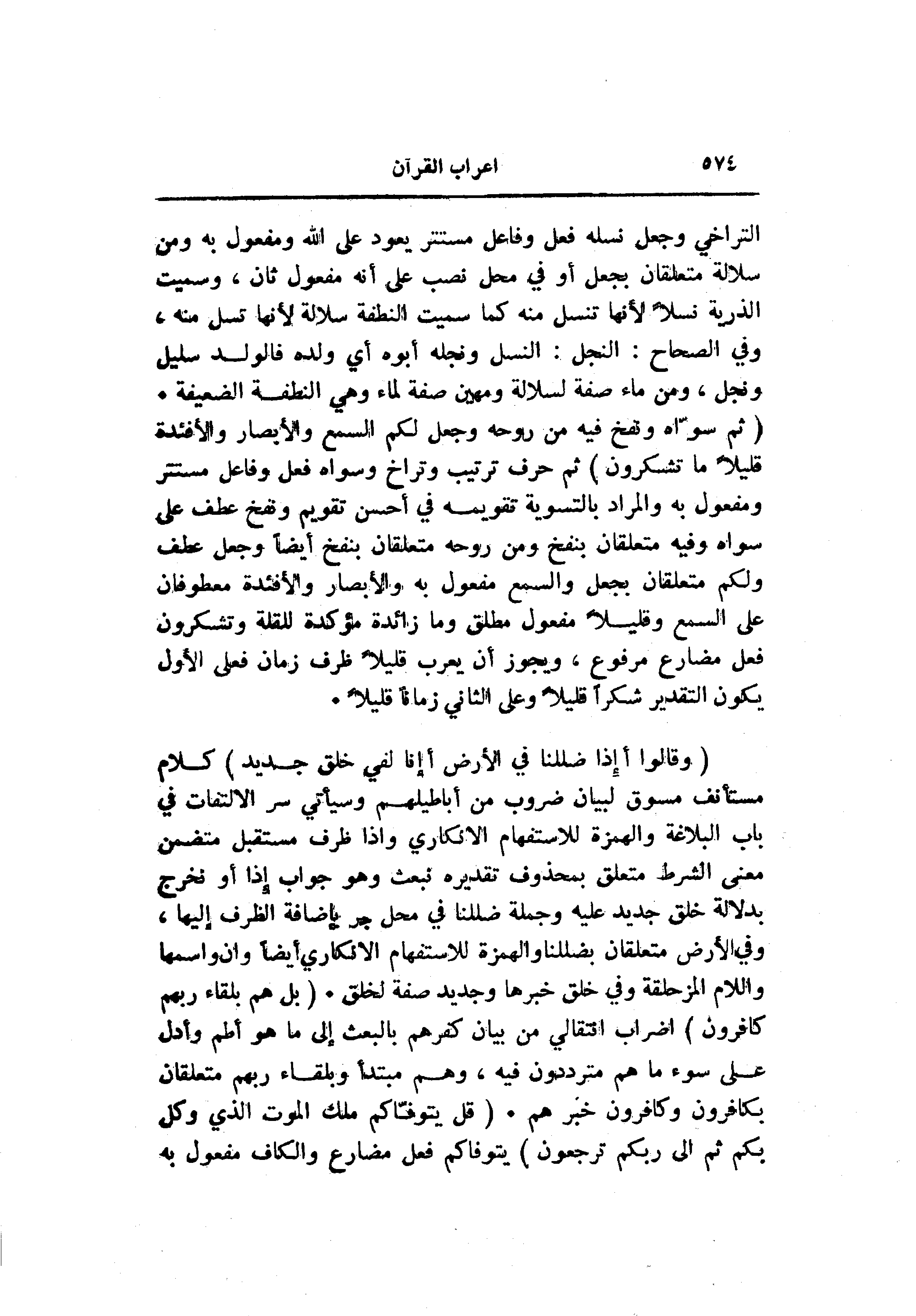(ثُمَّ سَوَّاهُ وَنَفَخَ فِيهِ مِنْ رُوحِهِ وَجَعَلَ لَكُمُ السَّمْعَ وَالْأَبْصارَ وَالْأَفْئِدَةَ قَلِيلًا ما تَشْكُرُونَ) ثم حرف ترتيب وتراخ وسواه فعل وفاعل مستتر ومفعول به والمراد بالتسوية تقويمه في أحسن تقويم ونفخ عطف على سواه وفيه متعلقان بنفخ ومن روحه متعلقان بنفخ أيضا وجعل عطف ولكم متعلقان بجعل والسمع مفعول به والأبصار والأفئدة معطوفان على السمع وقليلا مفعول مطلق وما زائدة مؤكدة للقلة وتشكرون فعل مضارع مرفوع، ويجوز أن يعرب قليلا ظرف زمان فعلى الأول يكون التقدير شكرا قليلا وعلى الثاني زمانا قليلا.