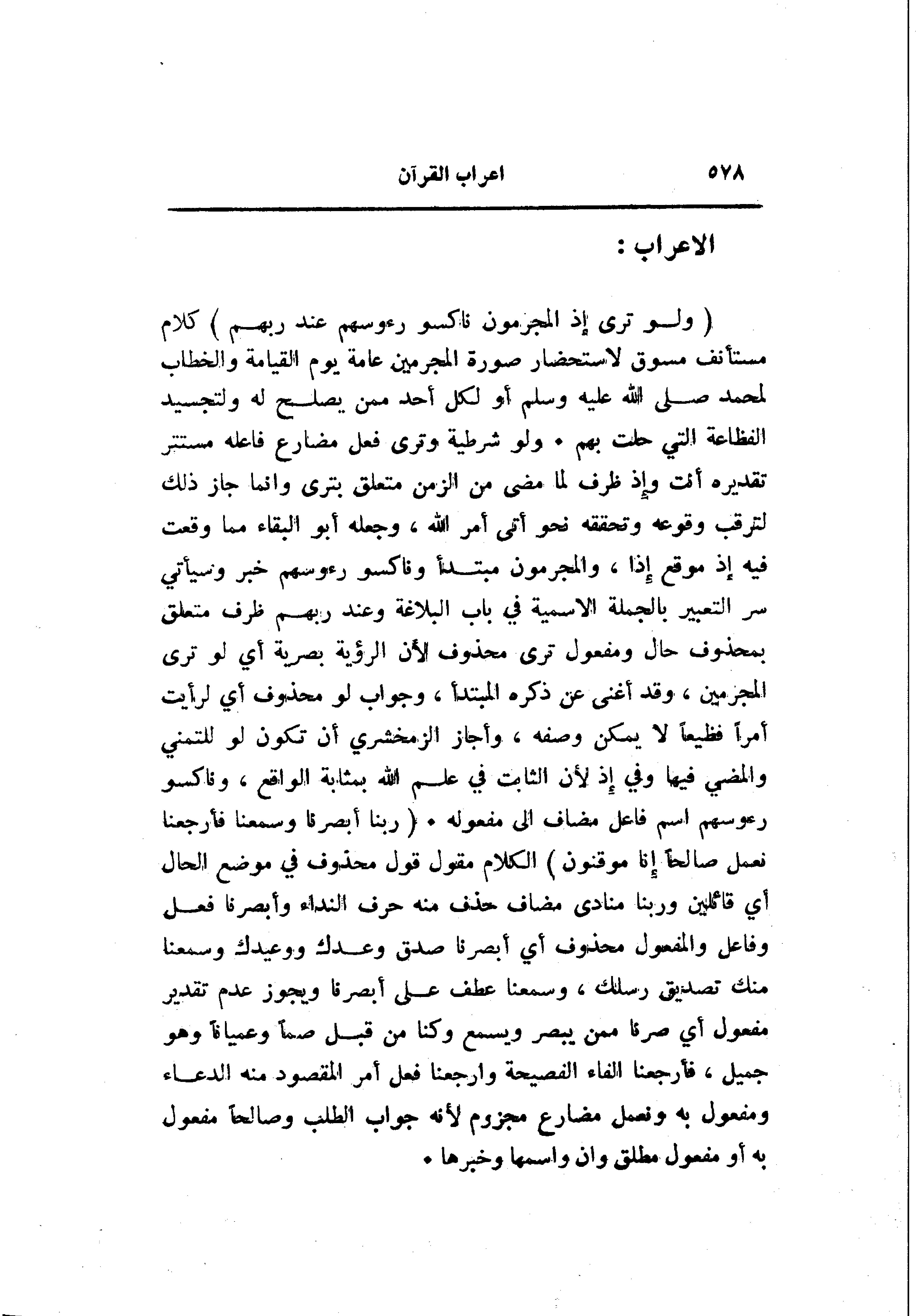 (وَلَوْ تَرى إِذِ الْمُجْرِمُونَ ناكِسُوا رُؤُسِهِمْ عِنْدَ رَبِّهِمْ) كلام مستأنف مسوق لاستحضار صورة المجرمين عامة يوم القيامة والخطاب لمحمد صلى الله عليه وسلم أو لكل أحد ممن يصلح له ولتجسيد الفظاعة التي حلت بهم. ولو شرطية وترى فعل مضارع فاعله مستتر تقديره أنت وإذ ظرف لما مضى من الزمن متعلق بتري وانما جاز ذلك لترقب وقوعه وتحققه نحو أتى أمر الله، وجعله أبو البقاء مما وقعت فيه إذ موقع إذا، والمجرمون مبتدأ وناكسو رءوسهم خبر وسيأتي سر التعبير بالجملة الاسمية في باب البلاغة وعند ربهم ظرف متعلق بمحذوف حال ومفعول ترى محذوف لأن الرؤية بصرية أي لو ترى المجرمين، وقد أغنى عن ذكره المبتدأ، وجواب لو محذوف أي لرأيت أمرا فظيعا لا يمكن وصفه، وأجاز الزمخشري أن تكون لو للتمني والمضي فيها وفي إذ لأن الثابت في علم الله بمثابة الواقع، وناكسو رءوسهم اسم فاعل مضاف الى مفعوله. (رَبَّنا أَبْصَرْنا وَسَمِعْنا فَارْجِعْنا نَعْمَلْ صالِحاً إِنَّا مُوقِنُونَ) الكلام مقول قول محذوف في موضع الحال أي قائلين وربنا منادى مضاف حذف منه حرف النداء وأبصرنا فعل وفاعل والمفعول محذوف أي أبصرنا صدق وعدك ووعيدك وسمعنا منك تصديق رسلك، وسمعنا عطف على أبصرنا ويجوز عدم تقدير مفعول أي صرنا ممن ببصر ويسمع وكنا من قبل صما وعميانا وهو جميل، فأرجعنا الفاء الفصيحة وارجعنا فعل أمر المقصود منه الدعاء ومفعول به ونعمل مضارع مجزوم لأنه جواب الطلب وصالحا مفعول به أو مفعول مطلق وان واسمها وخبرها.