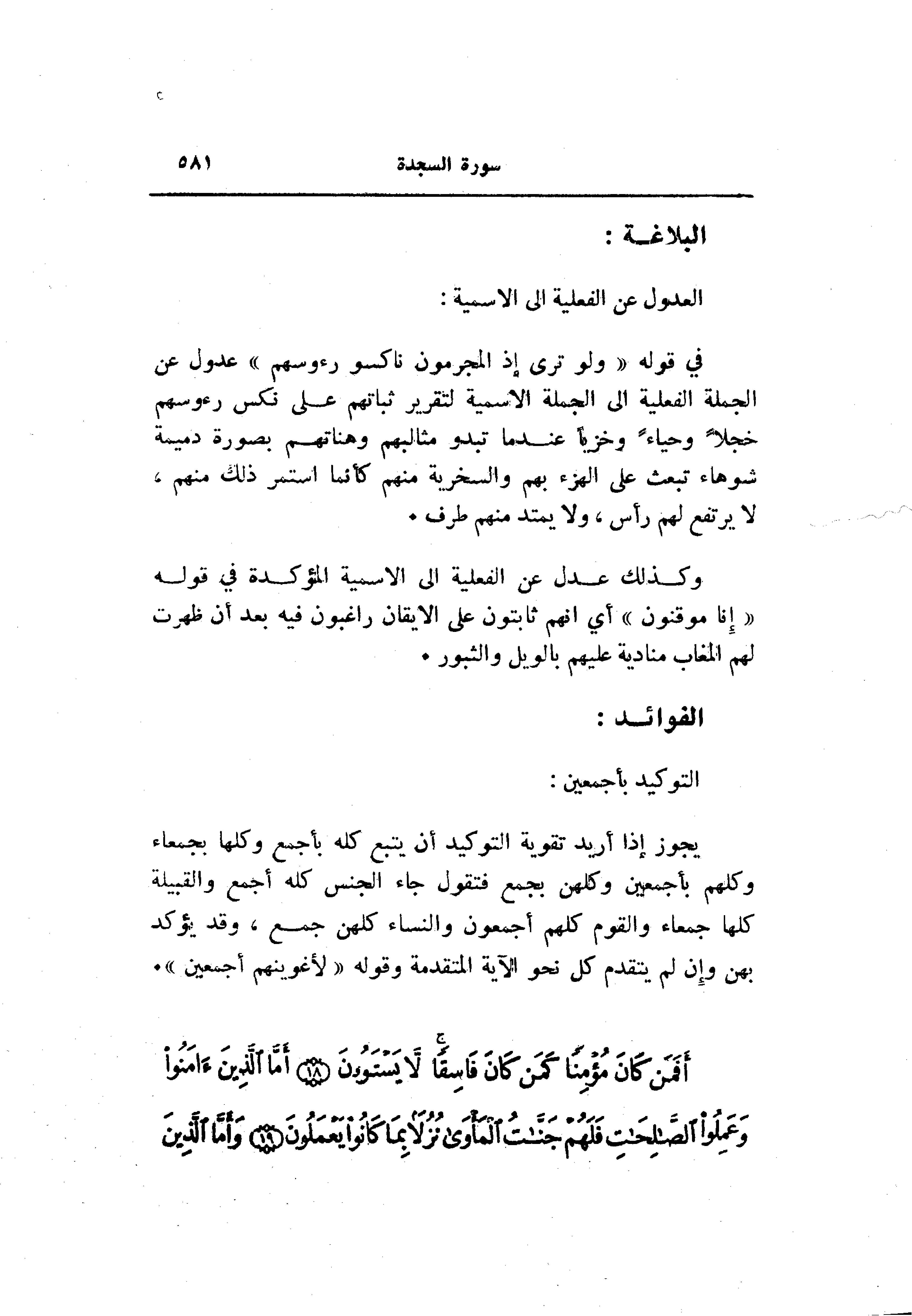 في قوله «ولو ترى إذ المجرمون ناكسو رءوسهم» عدول عن الجملة الفعلية الى الجملة الاسمية لتقرير ثباتهم على نكس رءوسهم خجلا وحياء وخزيا عند ما تبدو مثالبهم وهناتهم بصورة دميمة شوهاء تبعث على الهزء بهم والسخرية منهم كأنما استمر ذلك منهم، لا يرتفع لهم رأس، ولا يمتد منهم طرف.