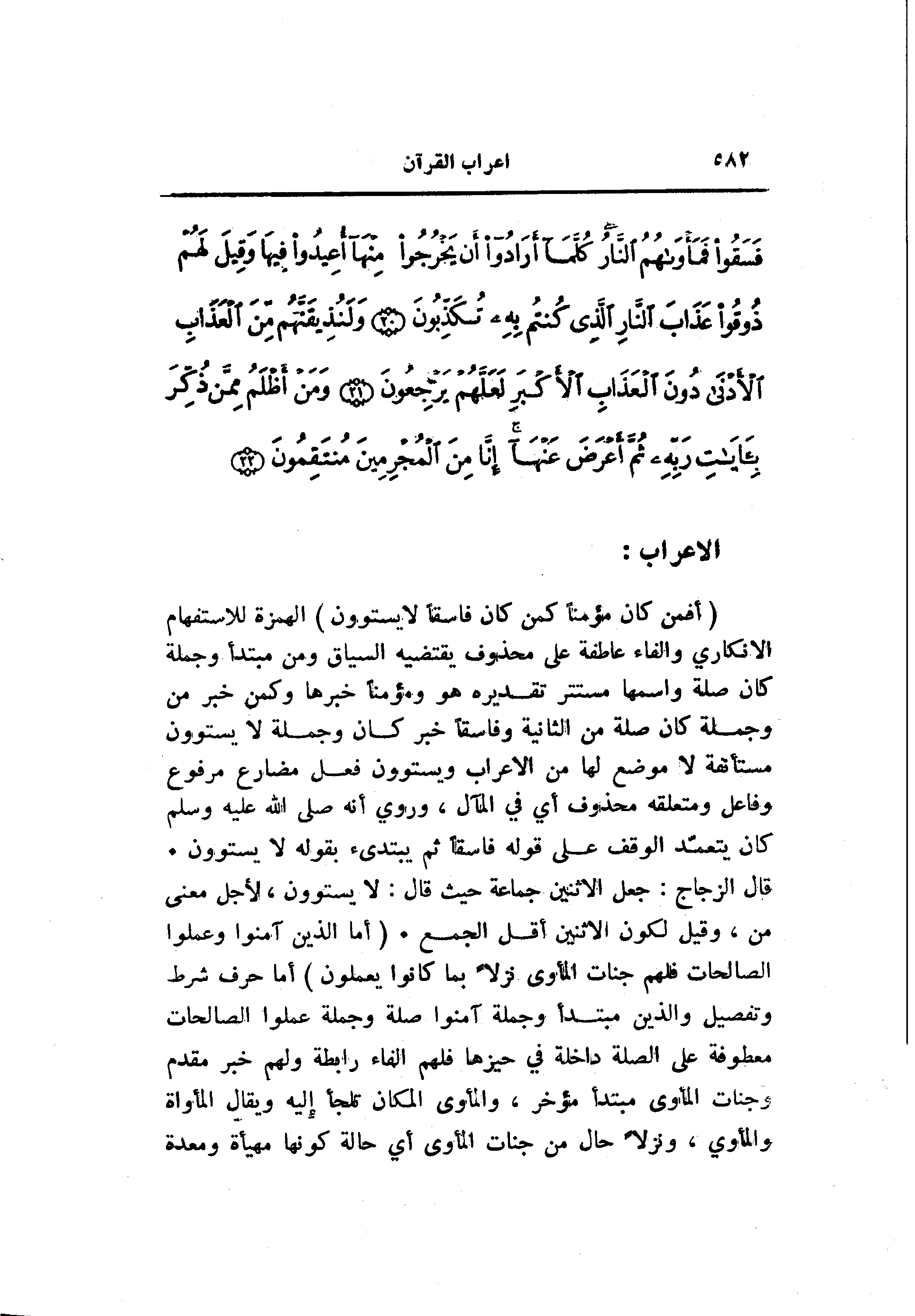 (أَفَمَنْ كانَ مُؤْمِناً كَمَنْ كانَ فاسِقاً لا يَسْتَوُونَ) الهمزة للاستفهام الانكاري والفاء عاطفة على محذوف يقتضيه السياق ومن مبتدأ وجملة كان صلة واسمها مستتر تقديره هو ومؤمنا خبرها وكمن خبر من وجملة كان صلة من الثانية وفاسقا خبر كان وجملة لا يستوون مستأنفة لا موضع لها من الاعراب ويستوون فعل مضارع مرفوع وفاعل ومتعلقه محذوف أي في المآل، وروي أنه صلى الله عليه وسلم كان يتعمّد الوقف على قوله فاسقا ثم يبتدىء بقوله لا يستوون.