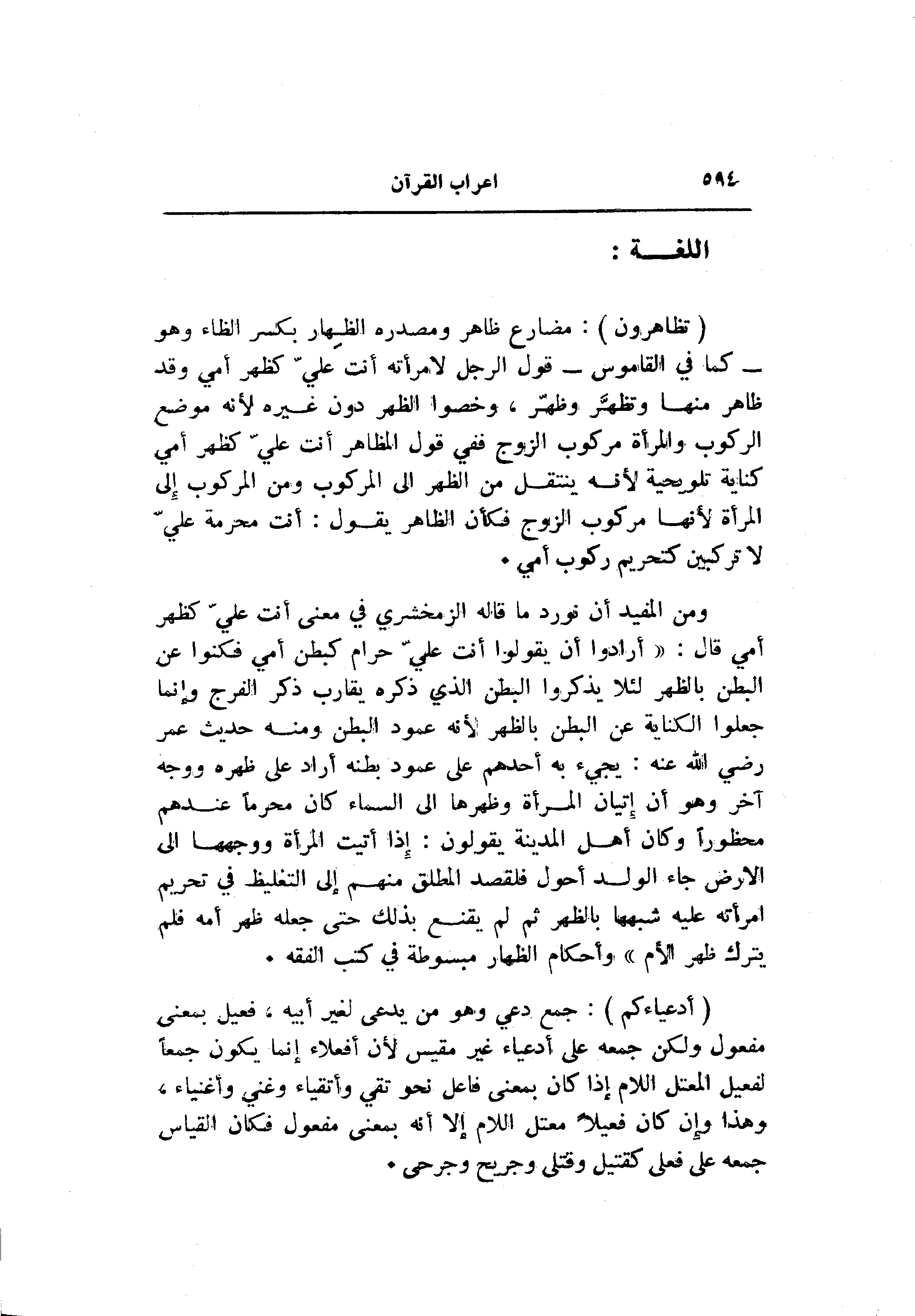 ومن المفيد أن نورد ما قاله الزمخشري في معنى أنت عليّ كظهر أمي قال: «أرادوا أن يقولوا أنت عليّ حرام كبطن أمي فكنوا عن البطن بالظهر لئلا يذكروا البطن الذي ذكره يقارب ذكر الفرج وإنما جعلوا الكناية عن البطن بالظهر لأنه عمود البطن ومنه حديث عمر رضي الله عنه: يجيء به أحدهم على عمود بطنه أراد على ظهره ووجه آخر وهو أن إتيان المرأة وظهرها الى السماء كان محرما عندهم محظورا وكان أهل المدينة يقولون: إذا أتيت المرأة ووجهها الى الأرض جاء الولد أحول فلقصد المطلق منهم إلى التغليظ في تحريم امرأته عليه شبهها بالظهر ثم لم يقنع بذلك حتى جعله ظهر أمه فلم يترك ظهر الأم» وأحكام الظهار مبسوطة في كتب الفقه.