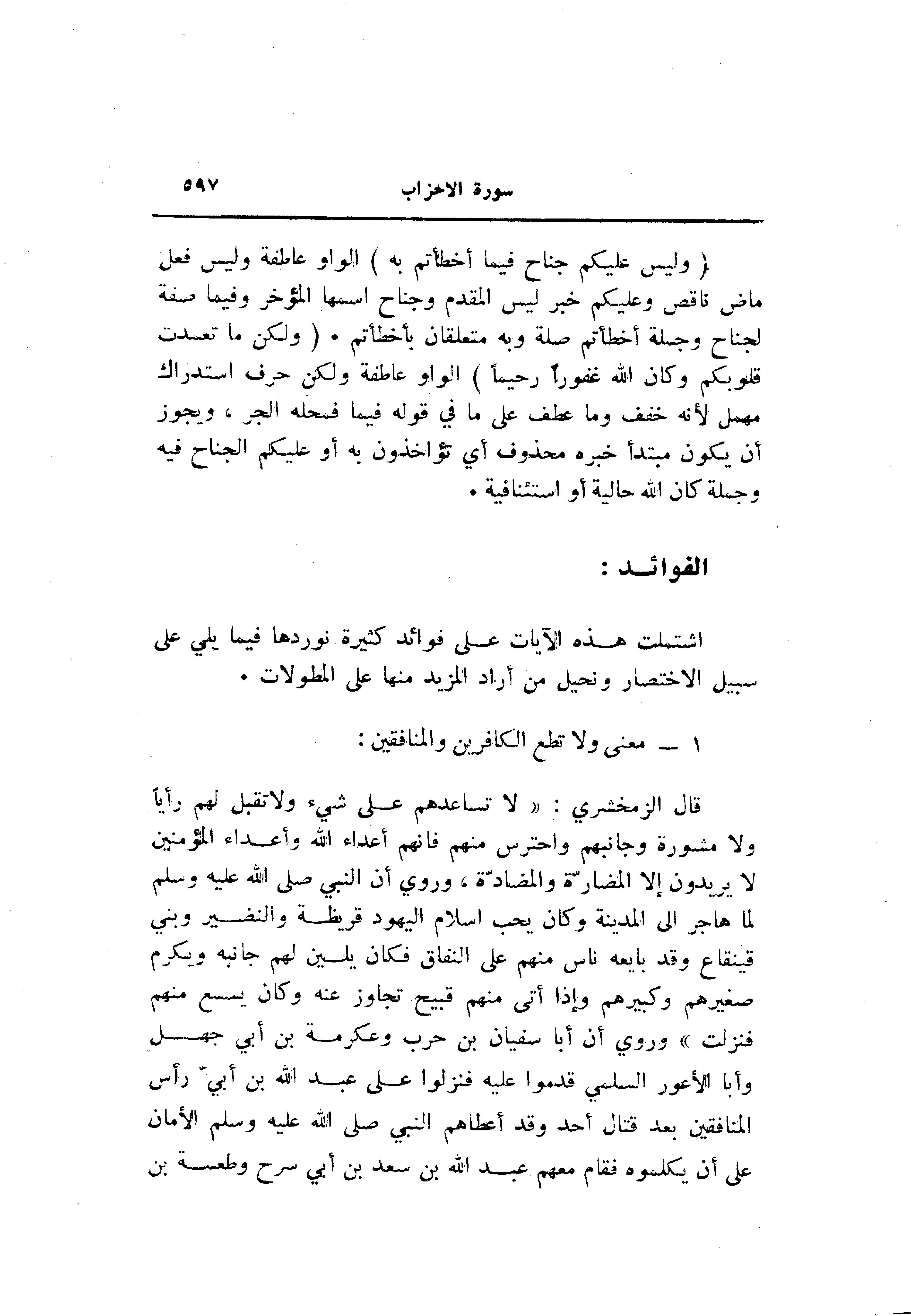 قال الزمخشري: «لا تساعدهم على شيء ولا تقبل لهم رأيا ولا مشورة وجانبهم واحترس منهم فانهم أعداء الله وأعداء المؤمنين لا يريدون إلا المضارّة والمضادّة، وروي أن النبي صلى الله عليه وسلم لما هاجر الى المدينة وكان يحب اسلام اليهود قريظة والنضير وبني قينقاع وقد بايعه ناس منهم على النفاق فكان يلين لهم جانبه ويكرم صغيرهم وكبيرهم وإذا أتى منهم قبيح تجاوز عنه وكان يسمع منهم فنزلت» وروي أن أبا سفيان بن حرب وعكرمة بن أبي جهل وأبا الأعور السلمي قدموا عليه فنزلوا على عبد الله بن أبيّ رأس المنافقين بعد قتال أحد وقد أعطاهم النبي صلى الله عليه وسلم الأمان على أن يكلموه فقام معهم عبد الله بن سعد بن أبي سرح وطعمة بن