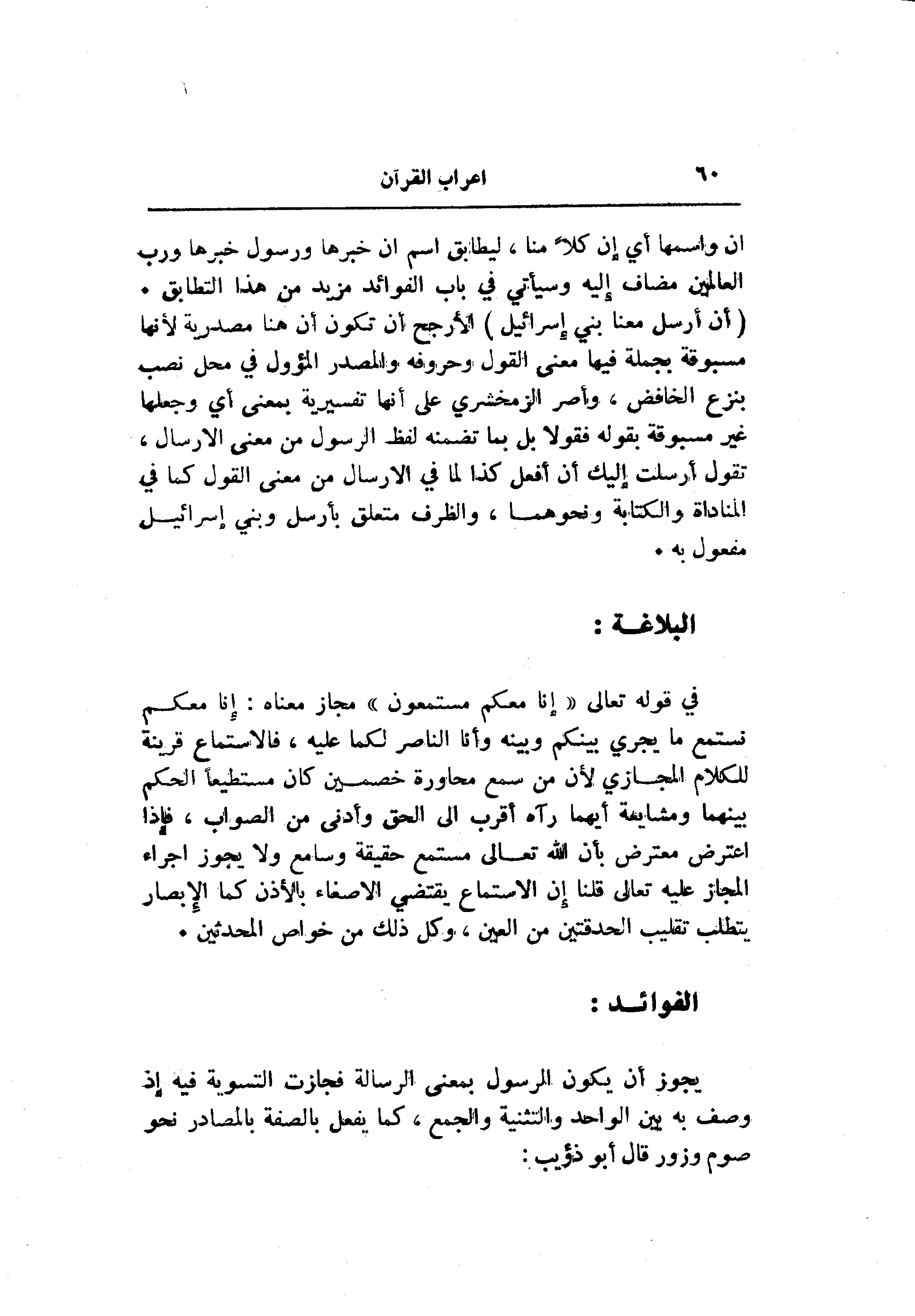 في قوله تعالى «إنا معكم مستمعون» مجاز معناه: إنا معكم نستمع ما يجري بينكم وبينه وأنا الناصر لكما عليه، فالاستماع قرينة للكلام المجازي لأن من سمع محاورة خصمين كان مستطيعا الحكم بينهما ومشايعة أيهما رآه أقرب الى الحق وأدنى من الصواب، فإذا اعترض معترض بأن الله تعالى مستمع حقيقة وسامع ولا يجوز اجراء المجاز عليه تعالى قلنا إن الاستماع يقتضي الإصغاء بالأذن كما الإبصار يتطلب تقليب الحدقتين من العين، وكل ذلك من خواص المحدثين.