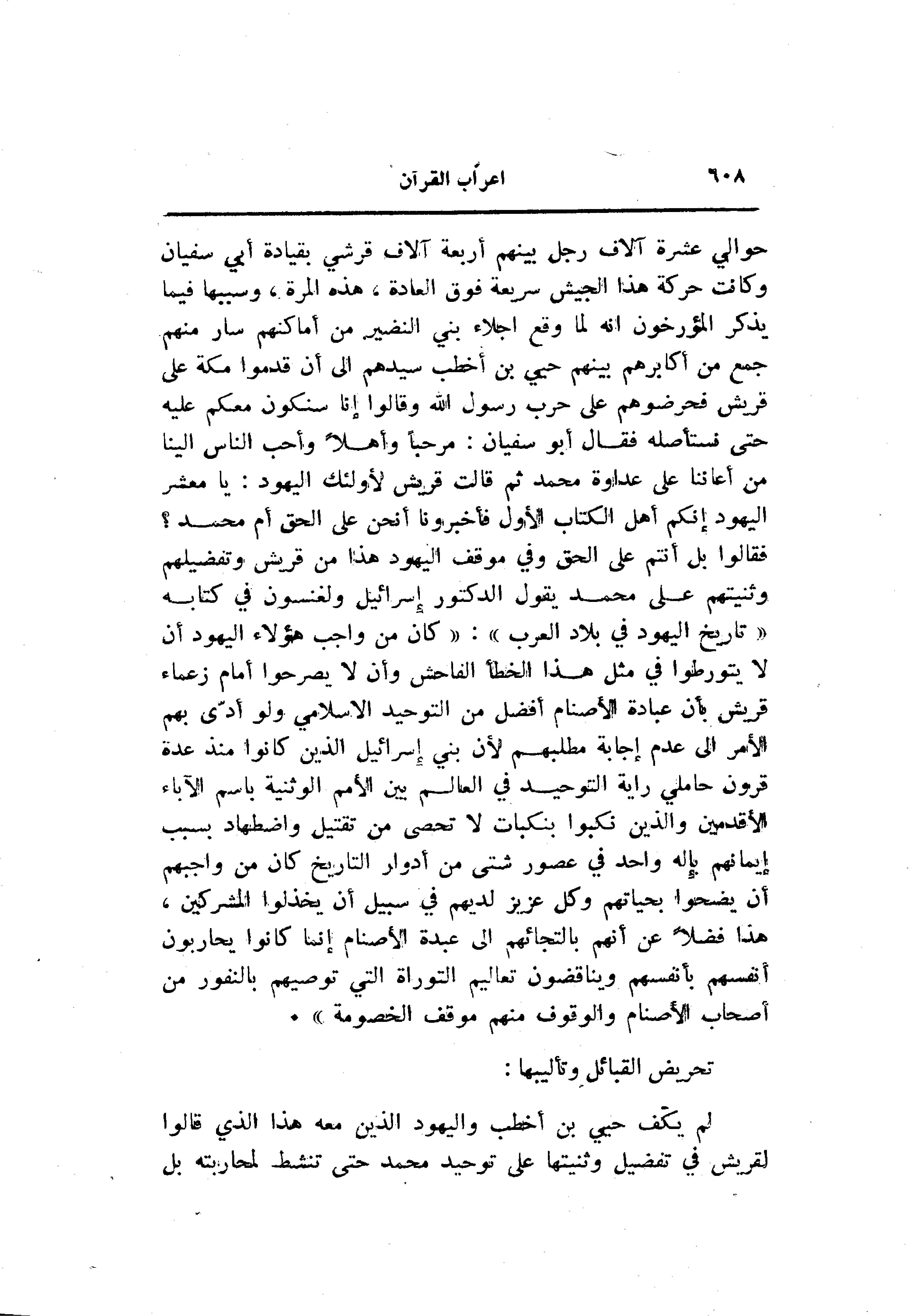 فقالوا بل أنتم على الحق وفي موقف اليهود هذا من قريش وتفضيلهم وثنيتهم على محمد يقول الدكتور إسرائيل ولغنسون في كتابه «تاريخ اليهود في بلاد العرب» : «كان من واجب هؤلاء اليهود أن لا يتورطوا في مثل هذا الخطأ الفاحش وأن لا يصرحوا أمام زعماء قريش بأن عبادة الأصنام أفضل من التوحيد الاسلامي ولو أدّى بهم الأمر الى عدم إجابة مطلبهم لأن بني إسرائيل الذين كانوا منذ عدة قرون حاملي راية التوحيد في العالم بين الأمم الوثنية باسم الآباء الأقدمين والذين نكبوا بنكبات لا تحصى من تقتيل واضطهاد بسبب إيمانهم بإله واحد في عصور شتى من أدوار التاريخ كان من واجبهم أن يضحوا بحياتهم وكل عزيز لديهم في سبيل أن يخذلوا المشركين، هذا فضلا عن أنهم بالتجائهم الى عبدة الأصنام إنما كانوا يحاربون أنفسهم بأنفسهم ويناقضون تعاليم التوراة التي توصيهم بالنفور من أصحاب الأصنام والوقوف منهم موقف الخصومة» .