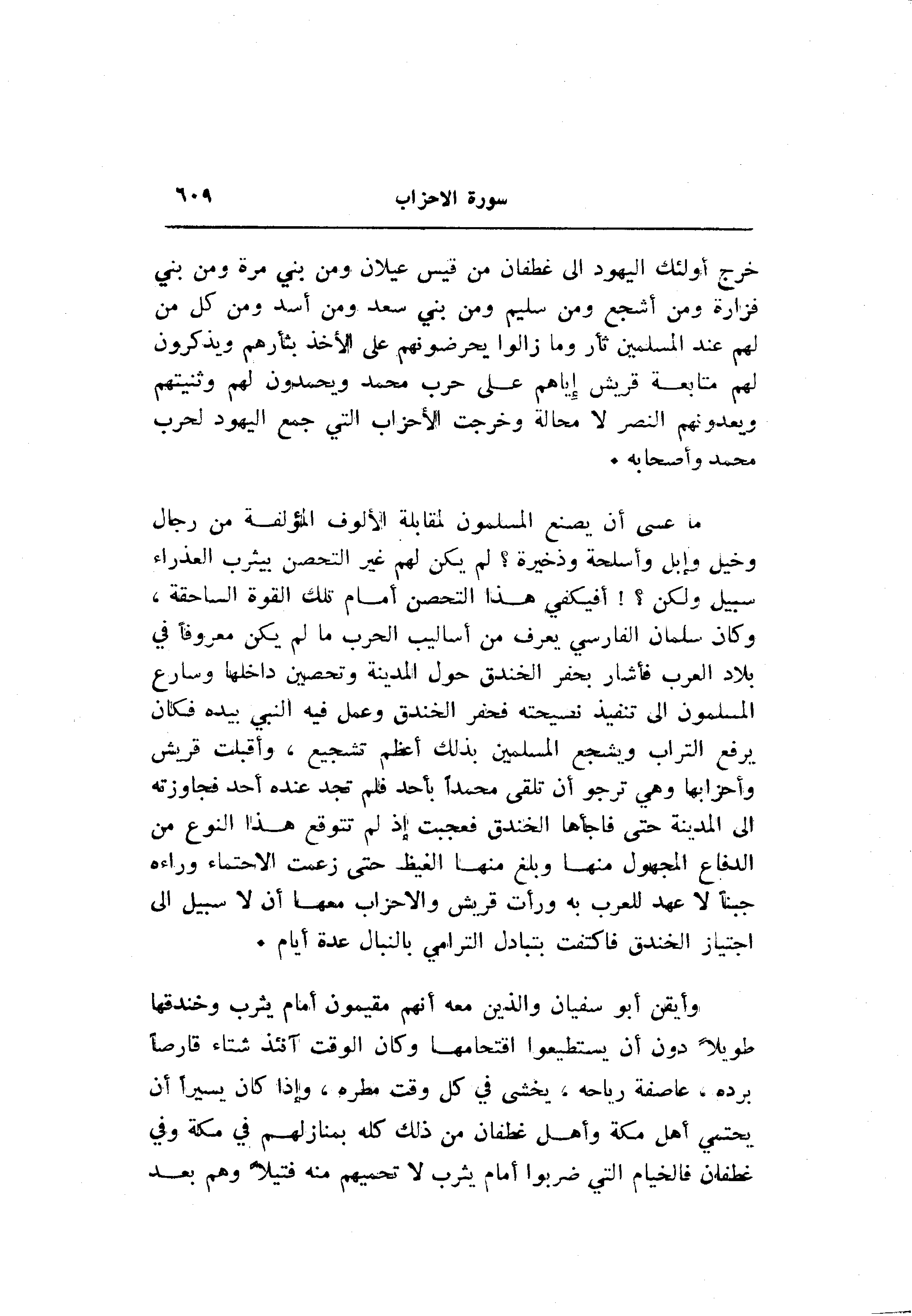 ما عسى أن يصنع المسلمون لمقابلة الألوف المؤلفة من رجال وخيل وإبل وأسلحة وذخيرة؟ لم يكن لهم غير التحصن بيثرب العذراء سبيل ولكن؟! أفيكفي هذا التحصن أمام تلك القوة الساحقة، وكان سلمان الفارسي يعرف من أساليب الحرب ما لم يكن معروفا في بلاد العرب فأشار بحفر الخندق حول المدينة وتحصين داخلها وسارع المسلمون الى تنفيذ نصيحته فحفر الخندق وعمل فيه النبي بيده فكان يرفع التراب ويشجع المسلمين بذلك أعظم تشجيع، وأقبلت قريش وأحزابها وهي ترجو أن تلقى محمدا بأحد فلم تجد عنده أحد فجاوزته الى المدينة حتى فاجأها الخندق فعجبت إذ لم تتوقع هذا النوع من الدفاع المجهول منها وبلغ منها الغيظ حتى زعمت الاحتماء وراءه جبنا لا عهد للعرب به ورأت قريش والأحزاب معها أن لا سبيل الى اجتياز الخندق فاكتفت بتبادل الترامي بالنبال عدة أيام.