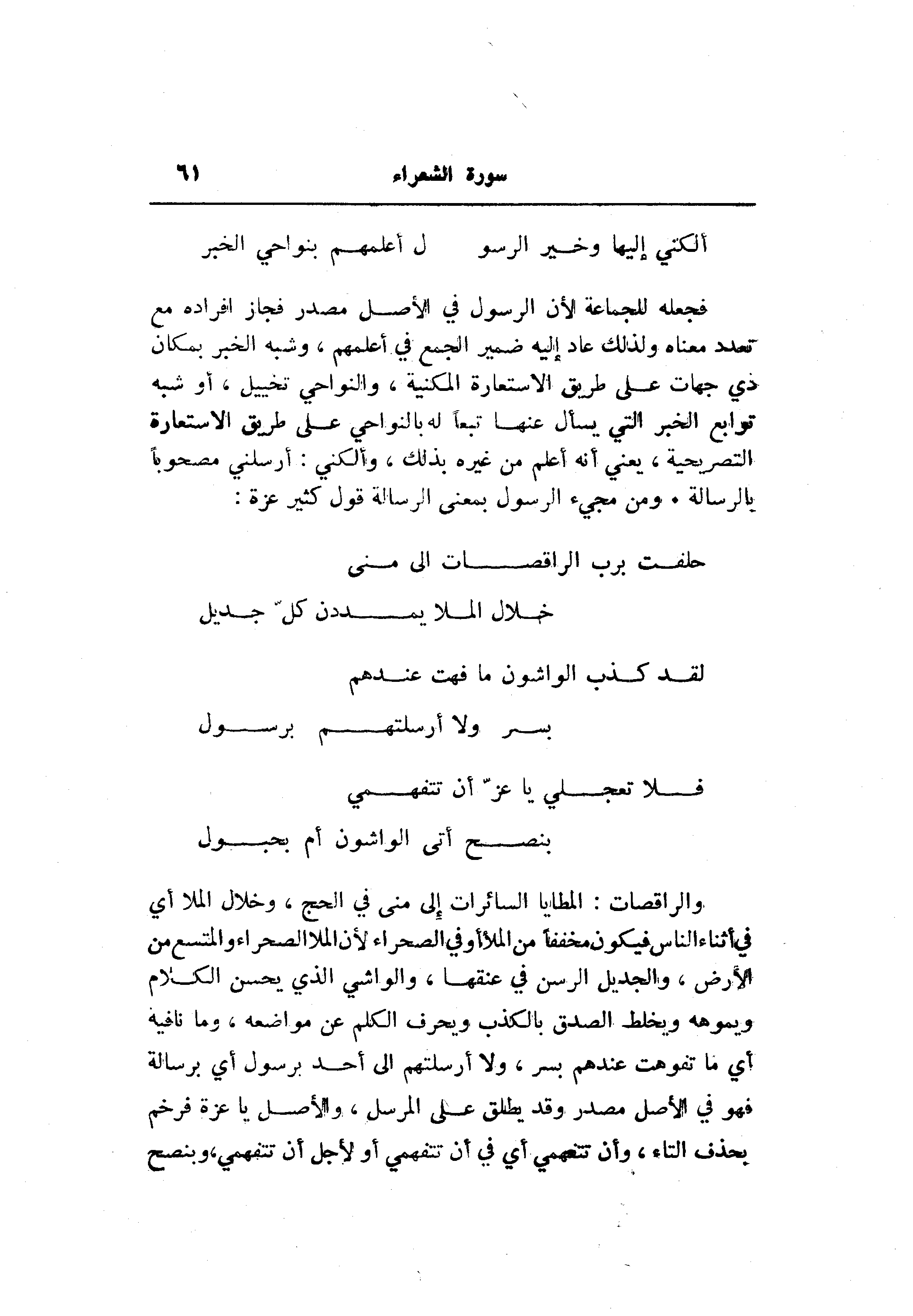 فجعله للجماعة لأن الرسول في الأصل مصدر فجاز افراده مع تعدد معناه ولذلك عاد إليه ضمير الجمع في أعلمهم، وشبه الخبر بمكان ذي جهات على طريق الاستعارة المكنية، والنواحي تخييل، أو شبه توابع الخبر التي يسأل عنها تبعا له بالنواحي على طريق الاستعارة التصريحية، يعني أنه أعلم من غيره بذلك، وألكني: أرسلني مصحوبا بالرسالة. ومن مجيء الرسول بمعنى الرسالة قول كثير عزة: