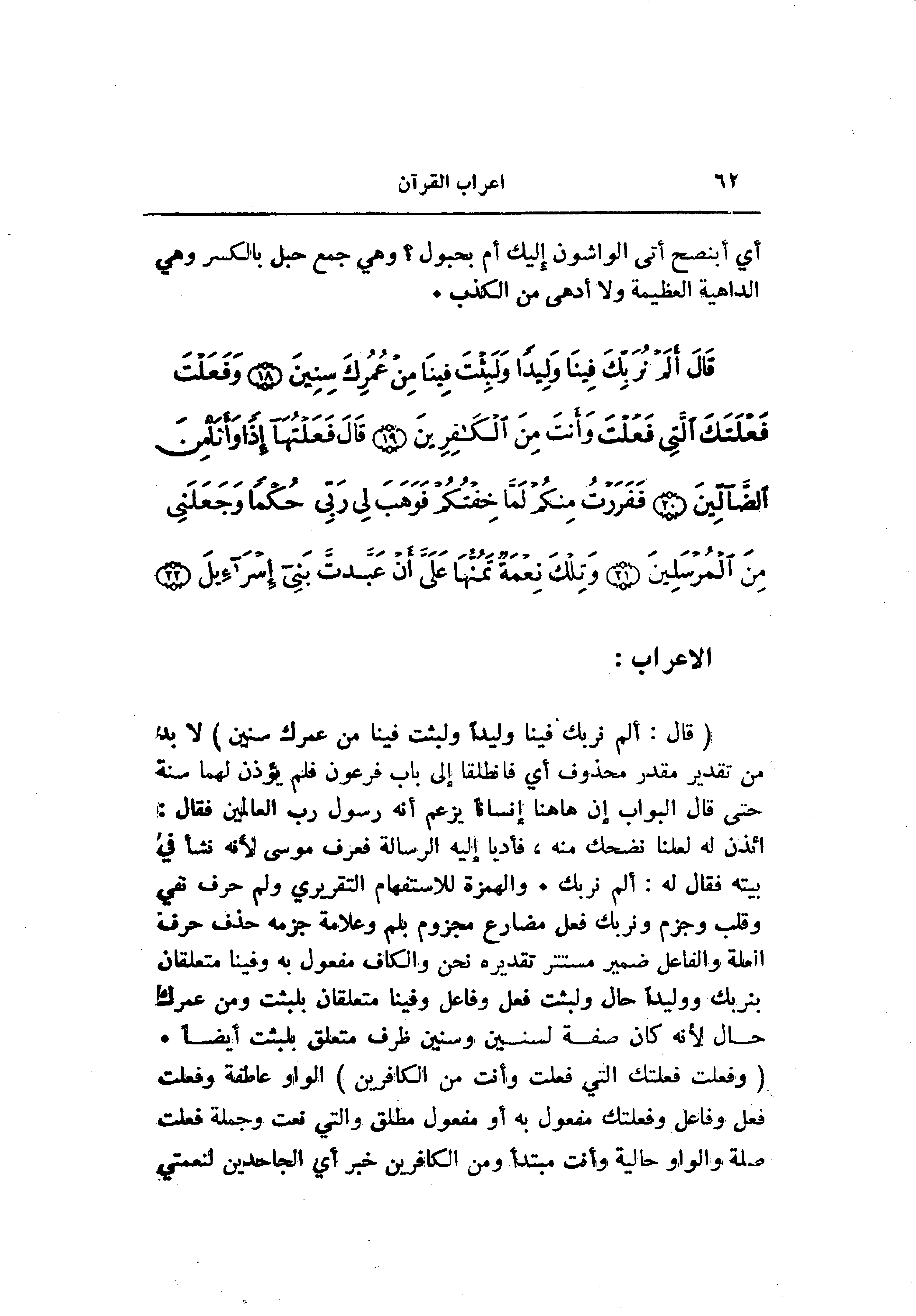 ائذن له لعلنا نضحك منه، فأديا إليه الرسالة فعرف موسى لأنه نشأ في بيته فقال له: ألم نربك. والهمزة للاستفهام التقريري ولم حرف نفي وقلب وجزم ونربك فعل مضارع مجزوم بلم وعلامة جزمه حذف حرف العلة والفاعل ضمير مستتر تقديره نحن والكاف مفعول به وفينا متعلقان بنربك ووليدا حال ولبثت فعل وفاعل وفينا متعلقان بلبثت ومن عمرك حال لأنه كان صفة لسنين وسنين ظرف متعلق بلبثت أيضا.