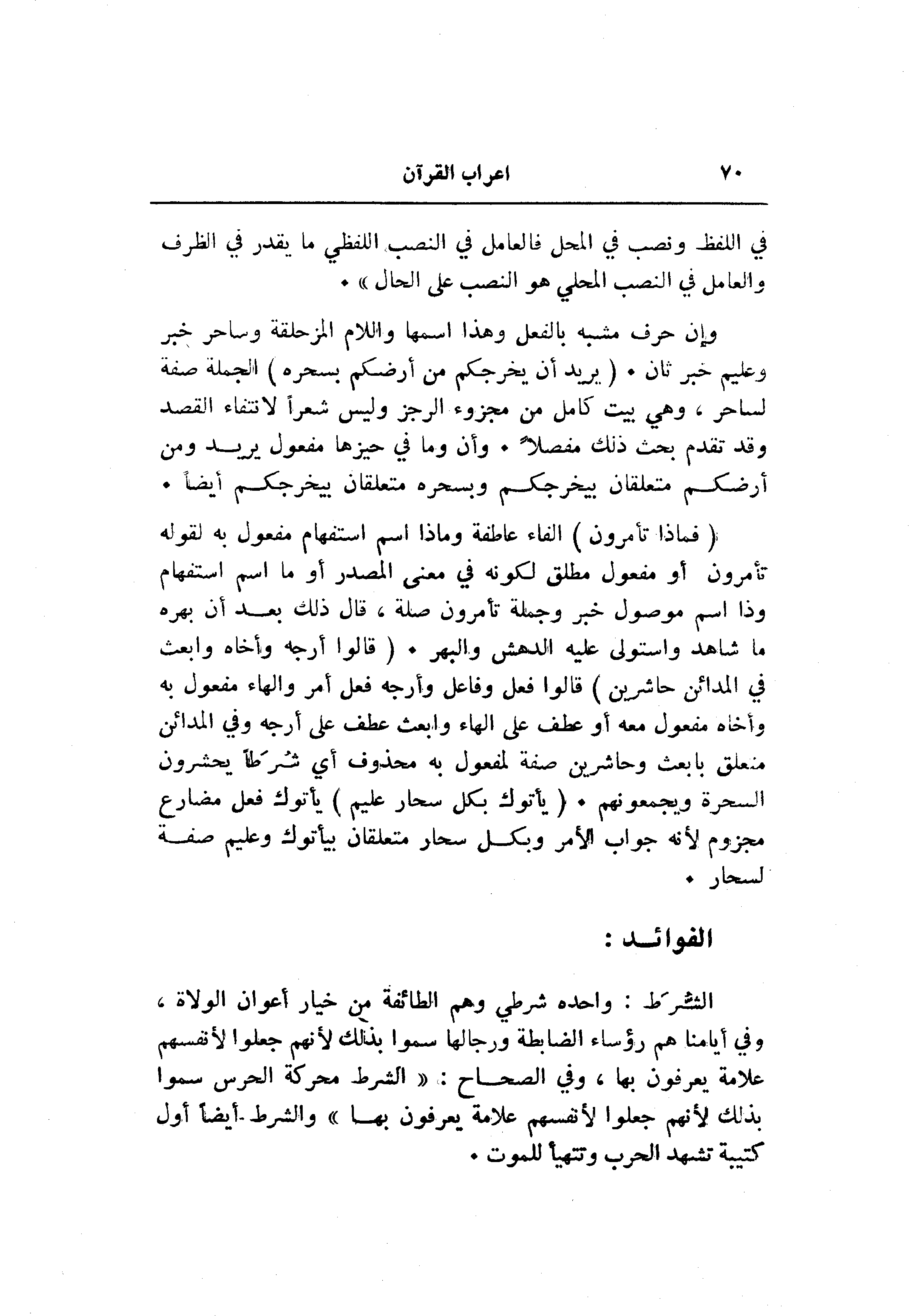 (فَماذا تَأْمُرُونَ) الفاء عاطفة وماذا اسم استفهام مفعول به لقوله تأمرون أو مفعول مطلق لكونه في معنى المصدر أو ما اسم استفهام وذا اسم موصول خبر وجملة تأمرون صلة، قال ذلك بعد أن بهره ما شاهد واستولى عليه الدهش والبهر. (قالُوا أَرْجِهْ وَأَخاهُ وَابْعَثْ فِي الْمَدائِنِ حاشِرِينَ) قالوا فعل وفاعل وأرجه فعل أمر والهاء مفعول به وأخاه مفعول معه أو عطف على الهاء وابعث عطف على أرجه وفي المدائن متعلق بابعث وحاشرين صفة لمفعول به محذوف أي شرطا يحشرون السحرة ويجمعونهم. (يَأْتُوكَ بِكُلِّ سَحَّارٍ عَلِيمٍ) يأتوك فعل مضارع مجزوم لأنه جواب الأمر وبكل سحار متعلقان بيأتوك وعليم صفة لسحار.