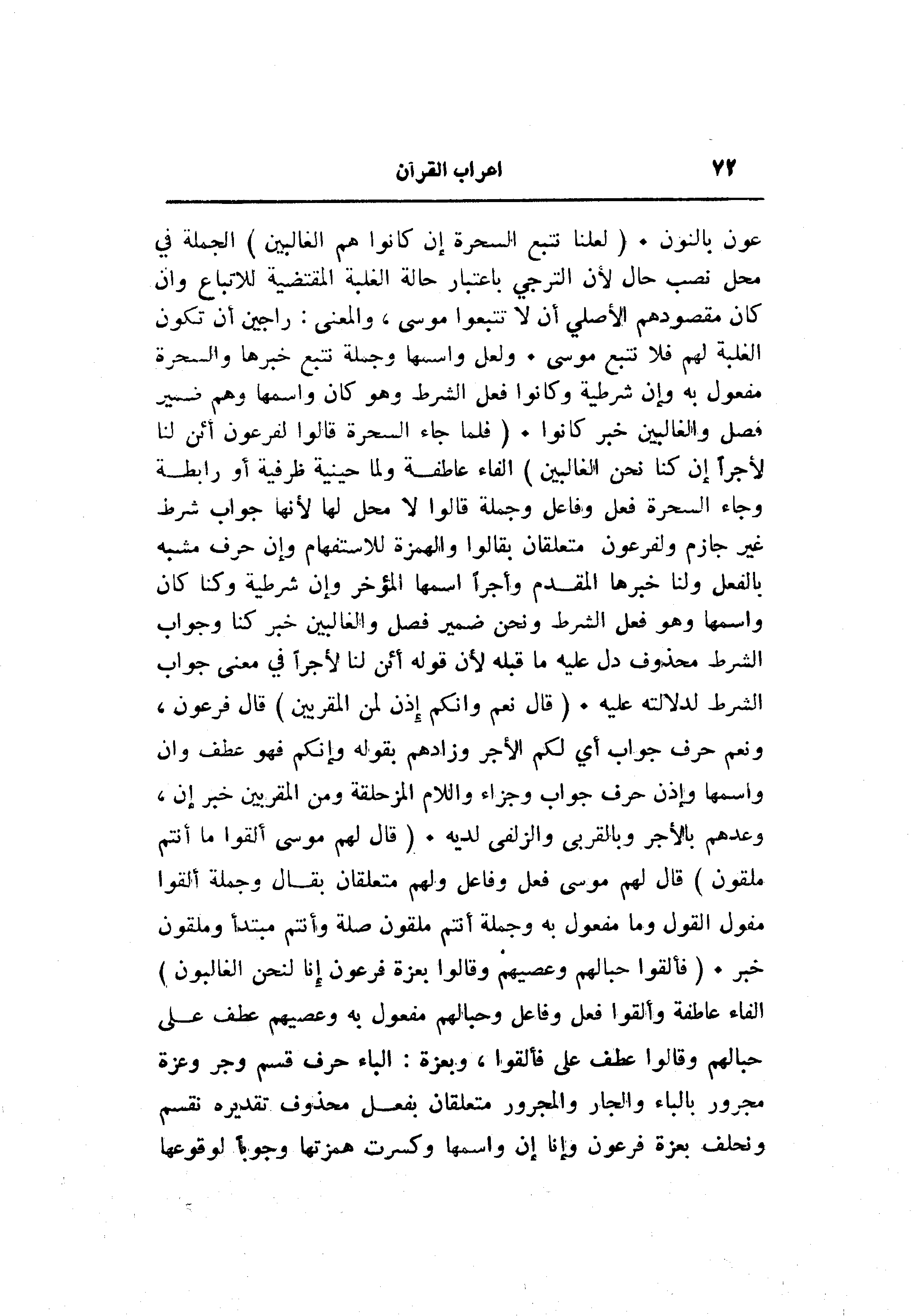 عون بالنون. (لَعَلَّنا نَتَّبِعُ السَّحَرَةَ إِنْ كانُوا هُمُ الْغالِبِينَ) الجملة في محل نصب حال لأن الترجي باعتبار حالة الغلبة المقتضية للاتباع وان كان مقصودهم الأصلي أن لا تتبعوا موسى، والمعنى: راجين أن تكون الغلبة لهم فلا تتبع موسى. ولعل واسمها وجملة تتبع خبرها والسحرة مفعول به وإن شرطية وكانوا فعل الشرط وهو كان واسمها وهم ضمير فصل والغالبين خبر كانوا. (فَلَمَّا جاءَ السَّحَرَةُ قالُوا لِفِرْعَوْنَ أَإِنَّ لَنا لَأَجْراً إِنْ كُنَّا نَحْنُ الْغالِبِينَ) الفاء عاطفة ولما حينية ظرفية أو رابطة وجاء السحرة فعل وفاعل وجملة قالوا لا محل لها لأنها جواب شرط غير جازم ولفرعون متعلقان بقالوا والهمزة للاستفهام وإن حرف مشبه بالفعل ولنا خبرها المقدم وأجرا اسمها المؤخر وإن شرطية وكنا كان واسمها وهو فعل الشرط ونحن ضمير فصل والغالبين خبر كنا وجواب الشرط محذوف دل عليه ما قبله لأن قوله أئن لنا لأجرا في معنى جواب الشرط لدلالته عليه. (قالَ نَعَمْ وَإِنَّكُمْ إِذاً لَمِنَ الْمُقَرَّبِينَ) قال فرعون، ونعم حرف جواب أي لكم الأجر وزادهم بقوله وإنكم فهو عطف وان واسمها وإذن حرف جواب وجزاء واللام المزحلقة ومن المقربين خبر إن، وعدهم بالأجر وبالقربى والزلفى لديه. (قالَ لَهُمْ مُوسى أَلْقُوا ما أَنْتُمْ مُلْقُونَ) قال لهم موسى فعل وفاعل ولهم متعلقان بقال وجملة ألقوا مفول القول وما مفعول به وجملة أنتم ملقون صلة وأنتم مبتدأ وملقون خبر. (فَأَلْقَوْا حِبالَهُمْ وَعِصِيَّهُمْ وَقالُوا بِعِزَّةِ فِرْعَوْنَ إِنَّا لَنَحْنُ الْغالِبُونَ) الفاء عاطفة وألقوا فعل وفاعل وحبالهم مفعول به وعصيهم عطف على حبالهم وقالوا عطف على فألقوا، وبعزة: الباء حرف قسم وجر وعزة مجرور بالباء والجار والمجرور متعلقان بفعل محذوف تقديره نقسم ونحلف بعزة فرعون وإنا إن واسمها وكسرت همزتها وجوبا لوقوعها