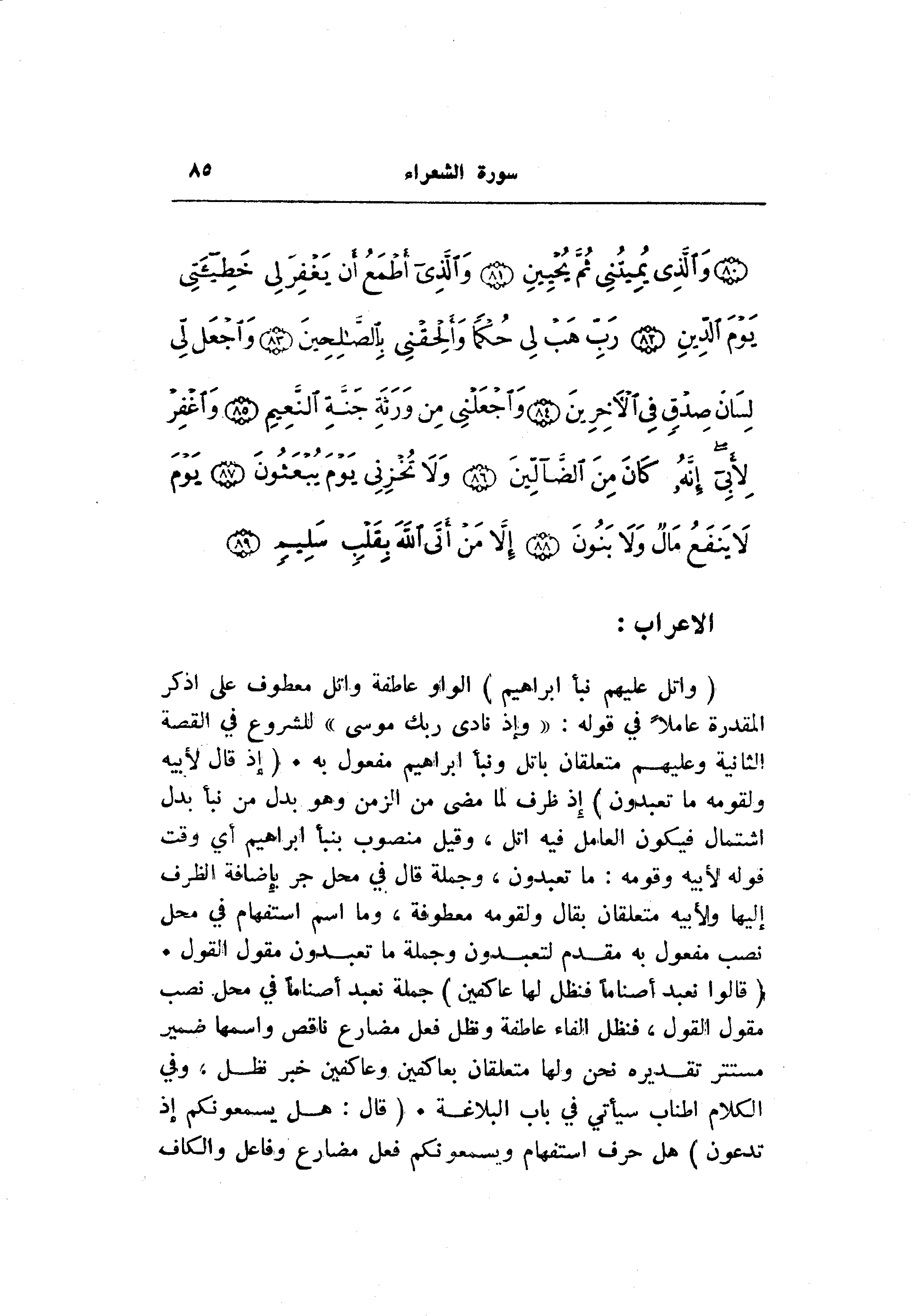 (قالُوا نَعْبُدُ أَصْناماً فَنَظَلُّ لَها عاكِفِينَ) جملة نعبد أصناما في محل نصب مقول القول، فنظل الفاء عاطفة ونظل فعل مضارع ناقص واسمها ضمير مستتر تقديره نحن ولها متعلقان بعاكفين وعاكفين خبر نظل، وفي الكلام اطناب سيأتي في باب البلاغة. (قالَ: هَلْ يَسْمَعُونَكُمْ إِذْ تَدْعُونَ) هل حرف استفهام ويسمعونكم فعل مضارع وفاعل والكاف