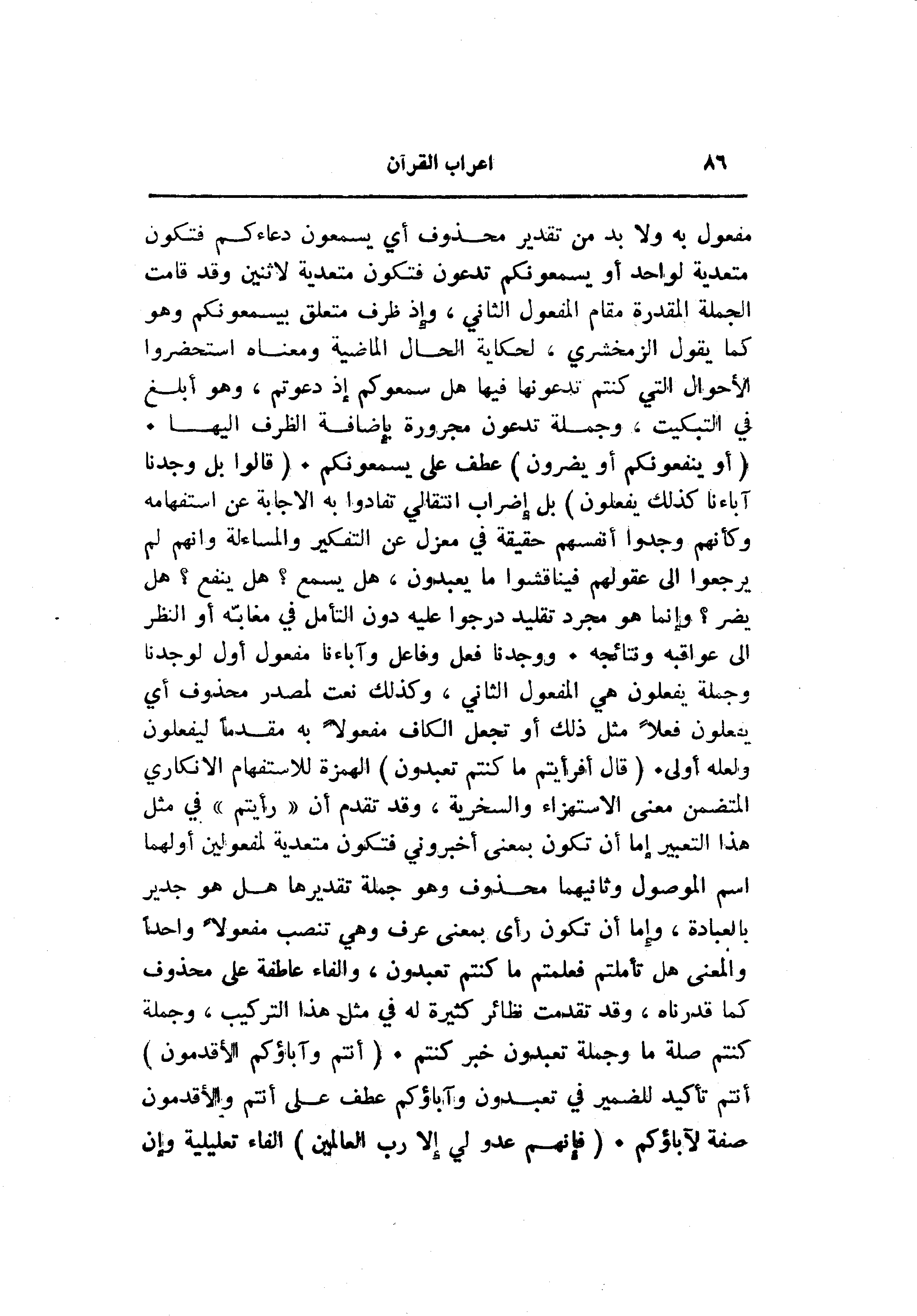 (أَوْ يَنْفَعُونَكُمْ أَوْ يَضُرُّونَ) عطف على يسمعونكم. (قالُوا بَلْ وَجَدْنا آباءَنا كَذلِكَ يَفْعَلُونَ) بل إضراب انتقالي تفادوا به الاجابة عن استفهامه وكأنهم وجدوا أنفسهم حقيقة في معزل عن التفكير والمساءلة وانهم لم يرجعوا الى عقولهم فيناقشوا ما يعبدون، هل يسمع؟ هل ينفع؟ هل يضر؟ وإنما هو مجرد تقليد درجوا عليه دون التأمل في مغابّه أو النظر الى عواقبه ونتائجه. ووجدنا فعل وفاعل وآباءنا مفعول أول لوجدنا وجملة يفعلون هي المفعول الثاني، وكذلك نعت لمصدر محذوف أي يفعلون فعلا مثل ذلك أو تجعل الكاف مفعولا به مقدما ليفعلون ولعله أولى. (قالَ أَفَرَأَيْتُمْ ما كُنْتُمْ تَعْبُدُونَ) الهمزة للاستفهام الانكاري المتضمن معنى الاستهزاء والسخرية، وقد تقدم أن «رأيتم» في مثل هذا التعبير إما أن تكون بمعنى أخبروني فتكون متعدية لمفعولين أولهما اسم الموصول وثانيهما محذوف وهو جملة تقديرها هل هو جدير بالعبادة، وإما أن تكون رأى بمعنى عرف وهي تنصب مفعولا واحدا والمعنى هل تأملتم فعلمتم ما كنتم تعبدون، والفاء عاطفة على محذوف كما قدرناه، وقد تقدمت نظائر كثيرة له في مثل هذا التركيب، وجملة كنتم صلة ما وجملة تعبدون خبر كنتم. (أَنْتُمْ وَآباؤُكُمُ الْأَقْدَمُونَ) أنتم تأكيد للضمير في تعبدون وآباؤكم عطف على أنتم والأقدمون صفة لآباؤكم. (فَإِنَّهُمْ عَدُوٌّ لِي إِلَّا رَبَّ الْعالَمِينَ) الفاء تعليلية وإن