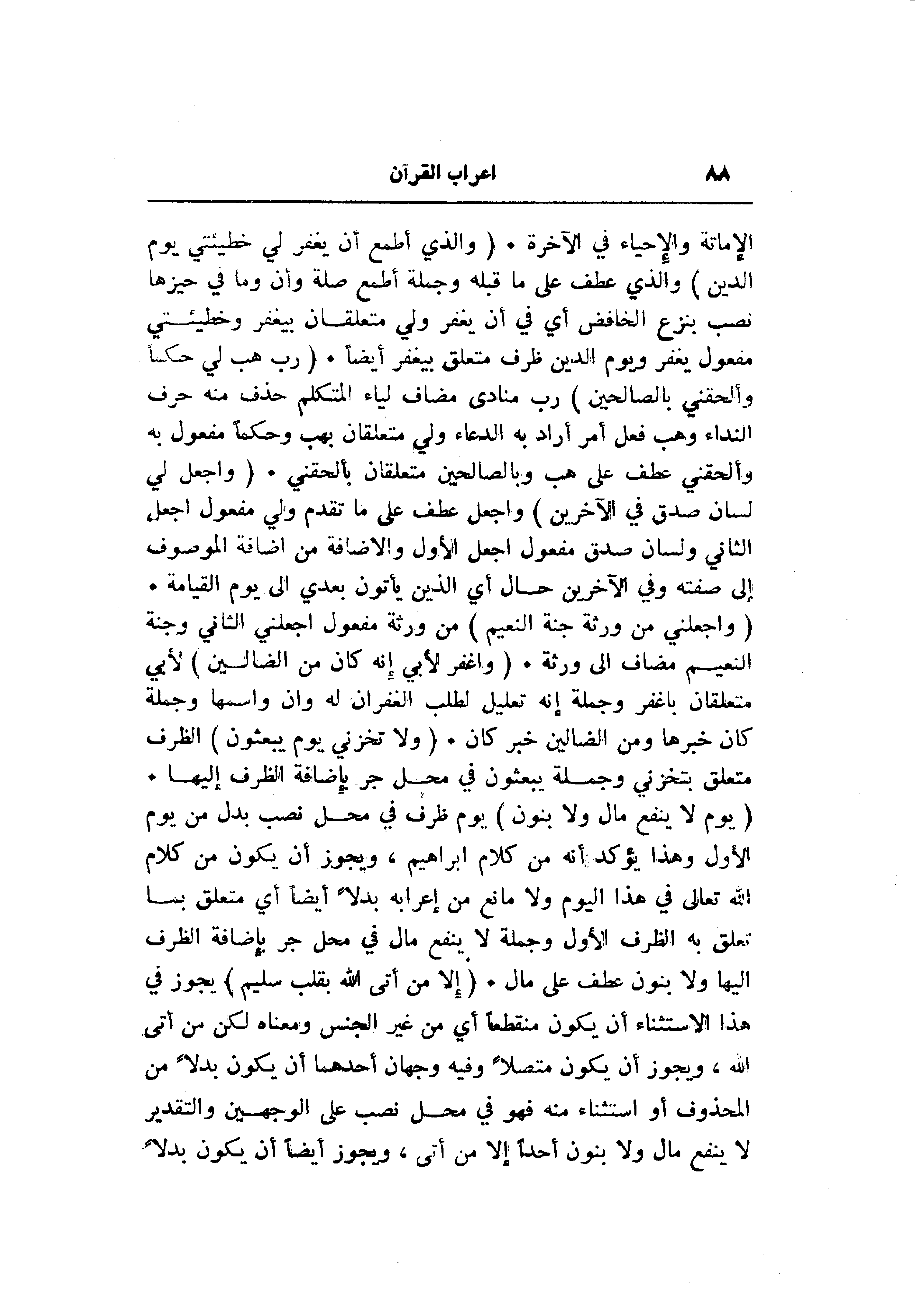 (يَوْمَ لا يَنْفَعُ مالٌ وَلا بَنُونَ) يوم ظرف في محل نصب بدل من يوم الأول وهذا يؤكد أنه من كلام ابراهيم، ويجوز أن يكون من كلام الله تعالى في هذا اليوم ولا مانع من إعرابه بدلا أيضا أي متعلق بما تعلق به الظرف الأول وجملة لا ينفع مال في محل جر بإضافة الظرف إليها ولا بنون عطف على مال. (إِلَّا مَنْ أَتَى اللَّهَ بِقَلْبٍ سَلِيمٍ) يجوز في هذا الاستثناء أن يكون منقطعا أي من غير الجنس ومعناه لكن من أتى الله، ويجوز أن يكون متصلا وفيه وجهان أحدهما أن يكون بدلا من المحذوف أو استثناء منه فهو في محل نصب على الوجهين والتقدير لا ينفع مال ولا بنون أحدا إلا من أتى، ويجوز أيضا أن يكون بدلا