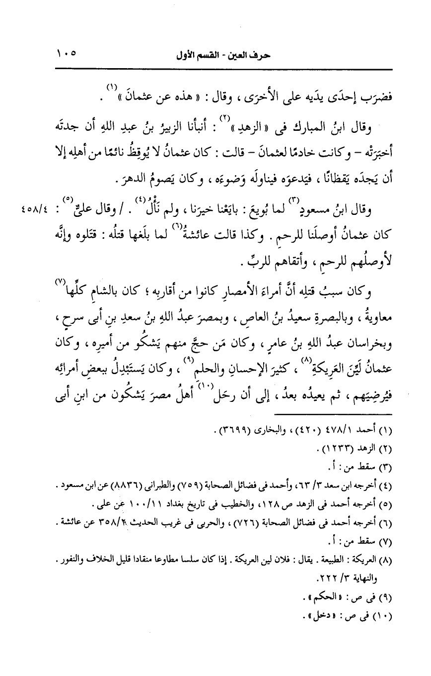 وقال ابن المبارك في الزهد: أنبأنا الزبير بن عبد الله أن جدته أخبرته- وكانت خادما لعثمان- قالت: كان عثمان لا يوقظ نائما من أهله إلا أن يجده يقظانا, فيدعوه فيناوله وضوءه, وكان يصوم الدهر.