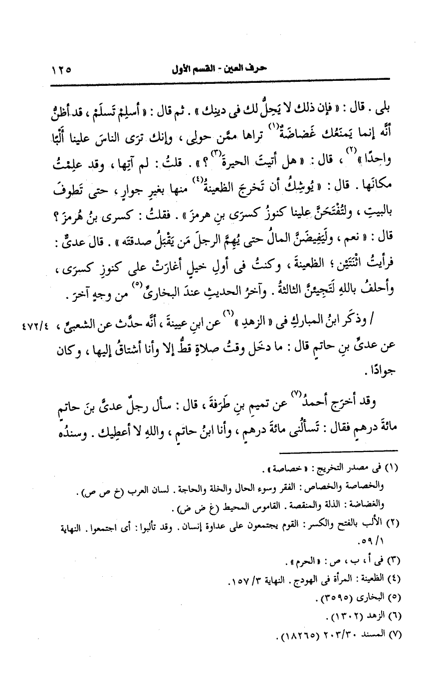 وقد أخرج أَحمد، عَن تميم بن طرفة قال سأل رجل عدي بن أبي حاتم مِئَة درهم فقال تسألني مِئَة درهم وأنا بن حاتم والله لا أعطيك وسنده صحيح.