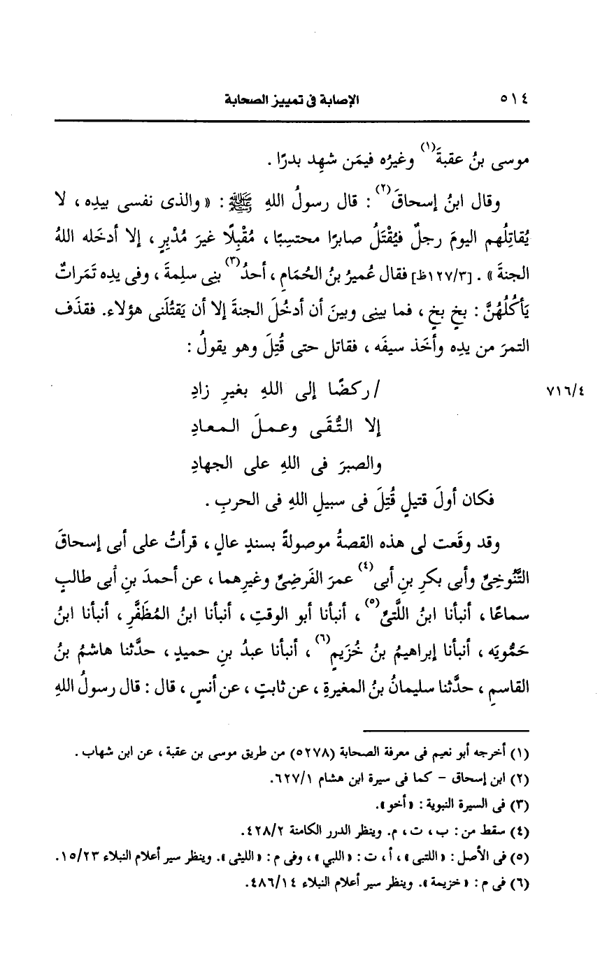 وقد وقعت لي هذه القصة موصولة بسند عال قرأت على أبي إسحاق التنوخي وأبي بكر بن عمر الفرضي وغيرهما عن أَحمد بن أبي طالب سماعا أنبأنا بن الليثي أنبأنا أَبو الوقت أنبأنا بن المظفر أنبأنا بن حمويه أنبأنا إبراهيم بن خزيمة أنبأنا عبد بن حميد، حَدَّثنا هاشم بن القاسم، حَدَّثنا سليمان بن المغيرة، عَن ثابت، عَن أنس قال: قال رَسُولُ اللهِ صَلى الله عَلَيه وسَلم "قوموا إلى جنة عرضها السماوات والأرض" فقال عمير بن الحمام، الأَنصارِيّ يا رسول الله جنة عرضها السماوات والأرض قال: نعم" قال بخ بخ قال: ما يحملك على قول بخ بخ" ؟ قال رجاء أن أكون من أهلها قال: فإنك من أهلها" فأخرج ثمرات من قرنه فجعل يأكل منها ثم قال لئن أنا حييت حتى آكل تمرا إنها لحياة طويلة قال فرمى بما كان معه من التمر ثم قاتلهم حتى قتل.