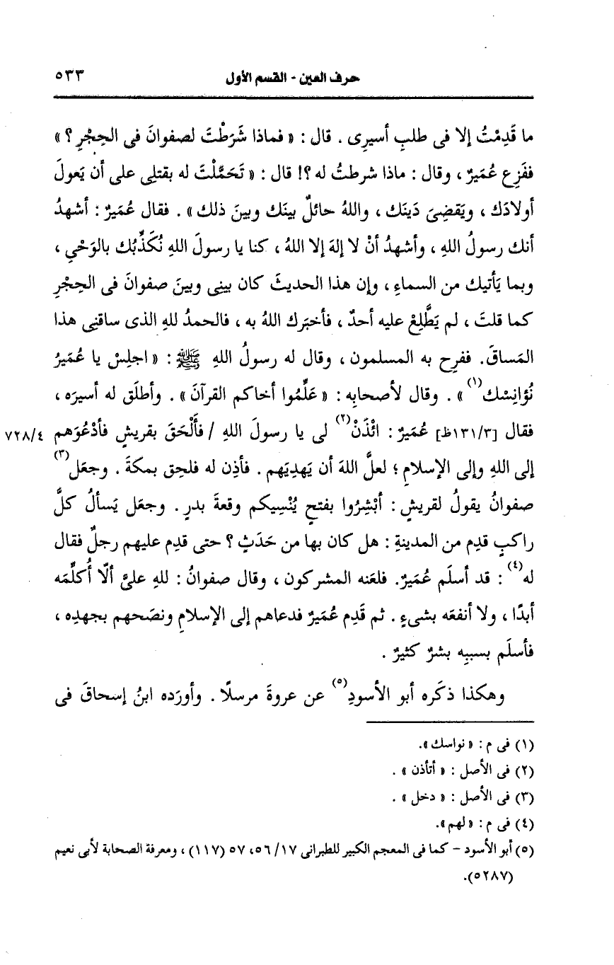 ففرح به المسلمون وقال له رسول الله صَلى الله عَلَيه وسَلم اجلس يا عمير نواسك وقال لأصحابه علموا أخاكم القرآن وأطلق له أسيره فقال عمير ائذن لي يا رسول الله فألحق بقريش فأدعوهم إلى الله وإلى الإسلام لعل الله أن يهديهم فأذن له فلحق بمكة وجعل صفوان يقول لقريش أبشروا بفتح ينسيكم وقعة بدر وجعل يسأل كل راكب قدم من المدينة هل كان بها من حدث ؟ حتى قدم عليهم رجل فقال لهم قد أسلم عمير فلعنه المشركون وقال صفوان لله علي الا أكلمه أبدا ولا أنفعه بشيء.