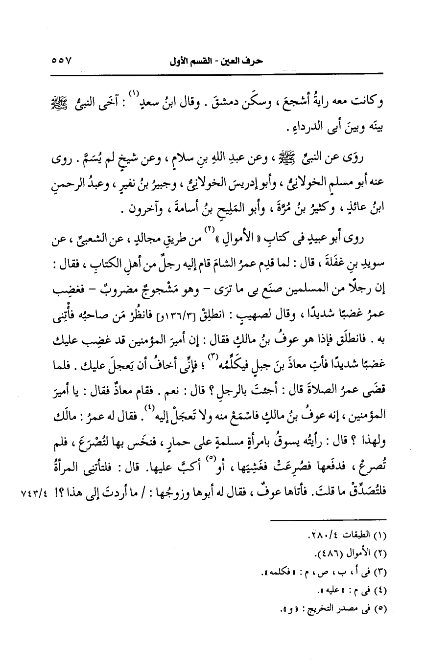 روى أَبو عبيد في كتاب "الأموال" من طريق مجالد، عَن الشعبي، عَن سويد بن غفلة قال لما قدم عمر الشام قام إليه رجل من أهل الكتاب فقال إن رجلا من المسلمين صنع بي ما ترى وهو مشجوج مضروب فغضب عمر غضبا شديدا وقال لصهيب انطلق فانظر من صاحبه فائتني به فانطلق فإذا هو عوف بن مالك فقال إن أمير المؤمنين قد غضب عليك غضبا شديدا فأت معاذ بن جبل فكلمه فإني أخاف أن يعجل عليك فلما قضى عمر الصلاة قال أجئت بالرجل قال نعم فقام معاذ فقال يا أمير المؤمنين إنه عوف بن مالك فاسمع منه ولا تعجل عليه فقال له عمر مالك ولهذا قال رايته يسوق بامرأة مسلمة على حمار فنخس بها لتصرع فلم تصرع فدفعها فصرعت فغشيها أو أكب عليها قال فلتأتني المرأة فلتصدق ما قلت: فأتاها عوف فقال له أبوها وزوجها ما أردت إلى هذا فضحتنا فقالت المرأة والله لأذهبن معه فقالا فنحن نذهب عنك فأتيا عمر فأخبراه بمثل قول عوف فأمر عمر باليهودي فصلب وقال ما على هذا صالحناكم.