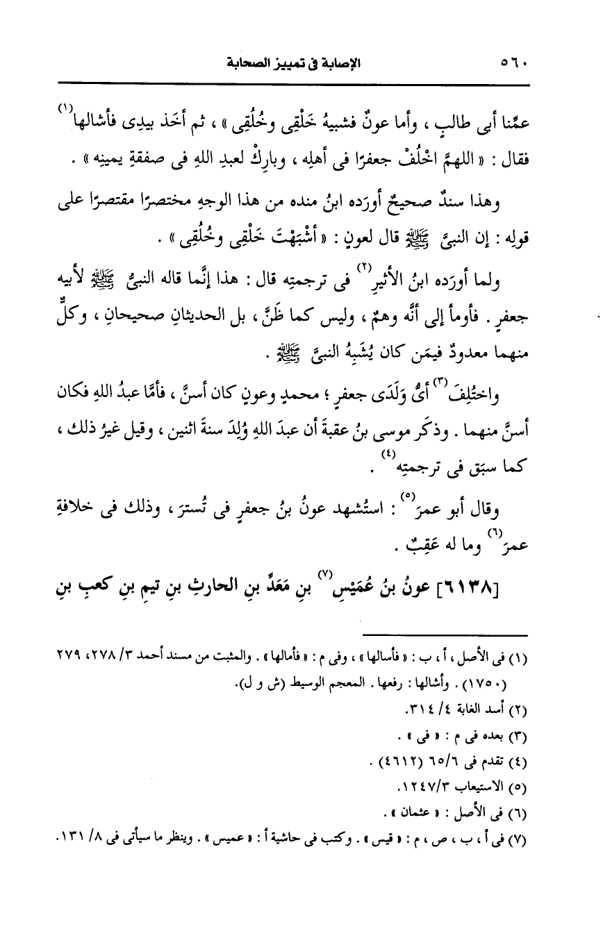 6138- (ز) عون بن قيس بن معد بن الحارث بن تيم بن كعب بن مالك بن قحافة بن عامر ابن سَعد بن مالك بن أنس بن وهب بن شهران بن عفرس بن حلف بن أفتل وهو خثعم الخثعمي أخو أسماء بنت عميس وأختها سلمى وخال أولاد جعفر وأبي بكر وحمزة وعلي.