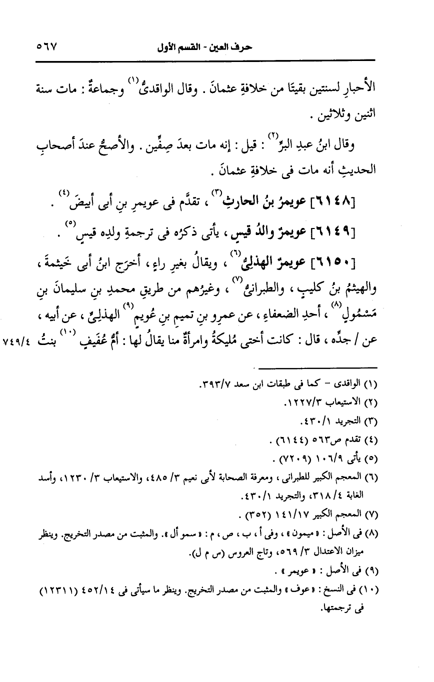 قال ابن الأثير أَخرجه ابن مَنْدَه، وأَبو نعيم في عويم بغير راء وذكرا له حديث الصيد ثم عادا وأخرجاه في عويمر بالراء وذكر له قصة المرأتين وهو واحد.