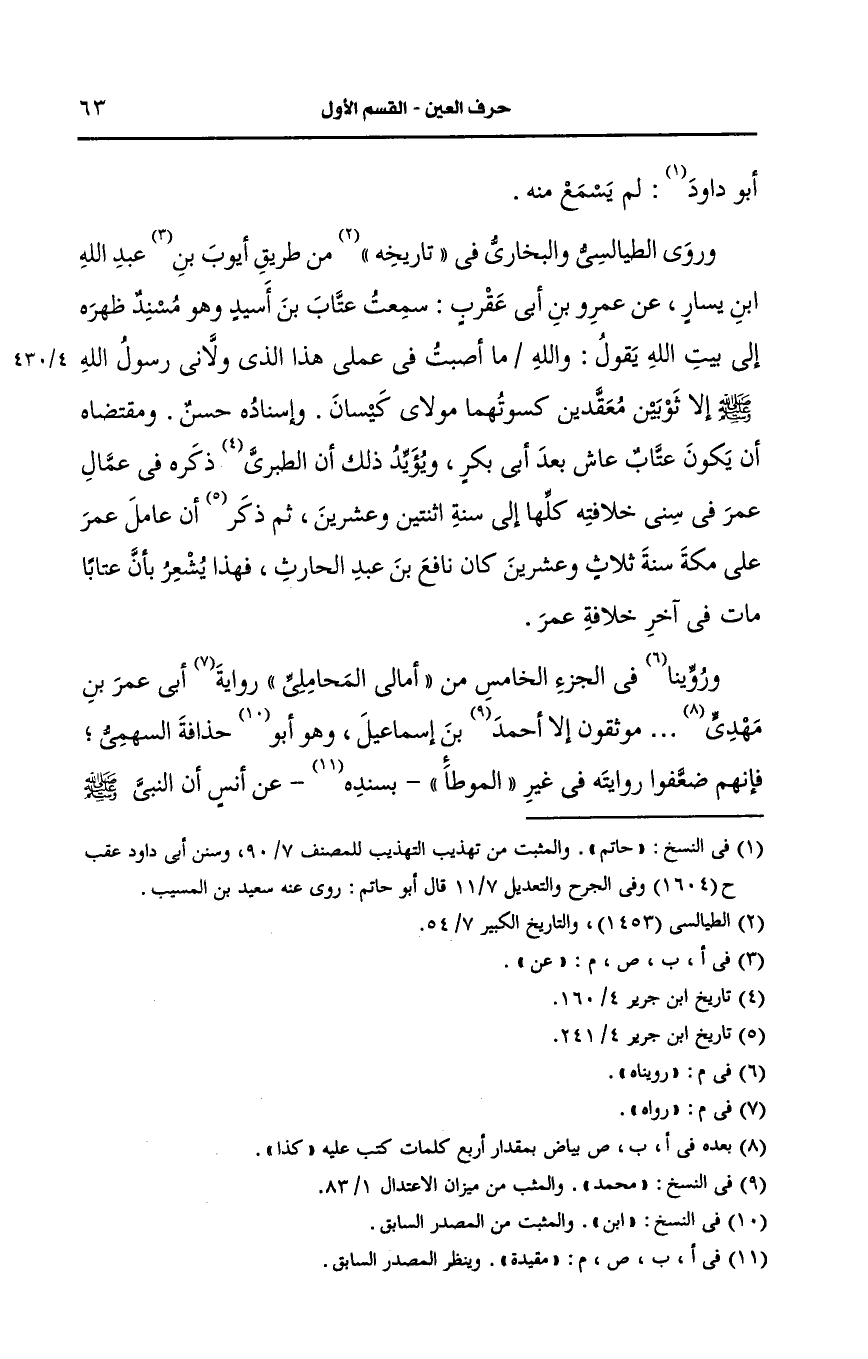 ورويناه في الجزء الخامس من أمالي المحاملي: رواه أبي عمر بن مهدي ...موثوقون إلا محمد بن إسماعيل وهو ابن حذافة السهمي فإنهم ضعفوا روايته في غير الموطأ مقيدة، عَن أنس أَنَّ النَّبِيَّ صَلى الله عَلَيه وسَلم استعمل عَتَّاب بن أَسِيْد على مكة،