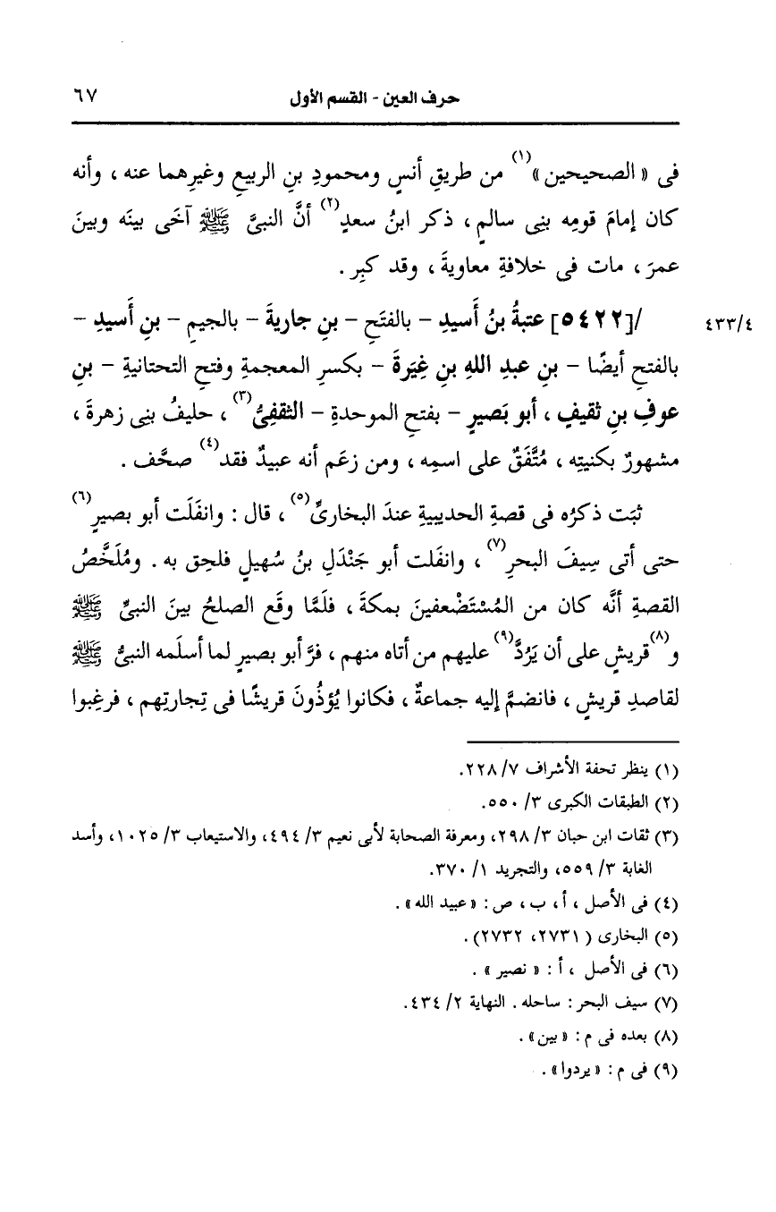 5422- عتبة بن أسيد بالفتح ابن جارية بالجيم بن أسيد بالفتح أيضًا ابن عَبد الله بن غيرة بكسر المعجمة وفتح التحتانية ابن عوف بن ثقيف أَبو بصير بفتح الموحدة الثَّقفي حليف بني زهرة.
