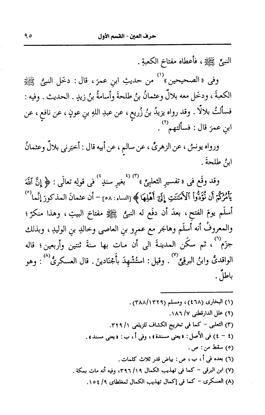 ورواه يونس، عَن الزُّهْرِيّ، عَن سالم، عَن أَبيه قال أخبرني بلال وعثمان بن طلحة وقد وقع في تفسير الثعلبي بغير سند في قوله تعالى إن الله يأمركم أن تؤدوا الأمانات الى أهلها ان عثمان المذكور إنما أسلم يوم الفتح بعد أن دفع له النَّبيّ صَلى الله عَلَيه وسَلم مفتاح البيت وهذا منكر.