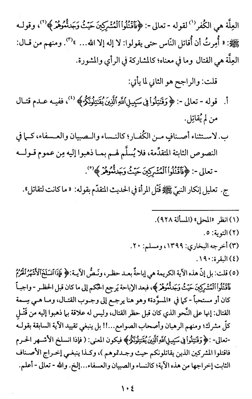 (¬5) قلت: بل إنّ هذه الآية الكريمة هي إباحةٌ بعد حظر، ونَصُّ الآية: {فَإِذَا انْسَلَخَ الْأَشْهُرُ الْحُرُمُ فَاقْتُلُوا الْمُشْرِكِينَ حَيْثُ وَجَدْتُمُوهُمْ}، فبعد الإباحة يَرجع الحُكم إلى ما كان قبل الحظر -واجباً كان أو مستحباً- كما في "المسوَّدة" وهو هنا يرجع إلى وجوب القتال، وما هي سِمة القتال: إنها على النَّحو الذي كان قبل حظر القتال، وليس له علاقة بما ذهبوا إليه من قَتْلِ كلّ مشرك؛ ومنهم الرهبان وأصحاب الصوامع ... !! بل ينبغي تقييد الآية السابقة بقوله -تعالى-: {وَقاتِلُوا في سَبِيلِ اللهِ الذين يُقاتِلُونَكم} فيكون المعنى: {فإذا انسلخ الأشهر الحرم فاقتلوا المشركين الذين يقاتلونكم حيث وجدتموهم}، وكذا ينبغي إخراج الأصناف الثابت إخراجها من هذه الآية؛ كالنساء والصبيان والعسفاء ... إلخ. والله -تعالى- أعلم.