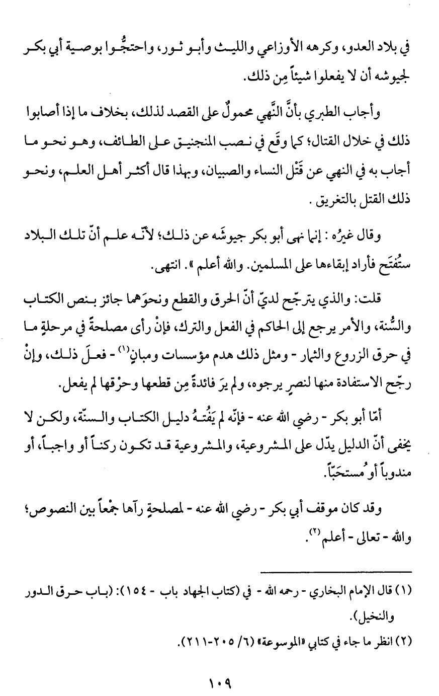 قلت: والذي يترجّح لديّ أنّ الحرق والقطع ونحوَهما جائز بنص الكتاب والسُّنة، والأمر يرجع إلى الحاكم في الفعل والترك، فإنْ رأى مصلحةً في مرحلةٍ ما في حرق الزروع والثمار -ومثل ذلك هدم مؤسسات ومبانٍ (¬1) - فعلَ ذلك، وإنْ رجّح الاستفادة منها لنصرٍ يرجوه، ولم يرَ فائدةً مِن قطعها وحرْقها لم يفعل.