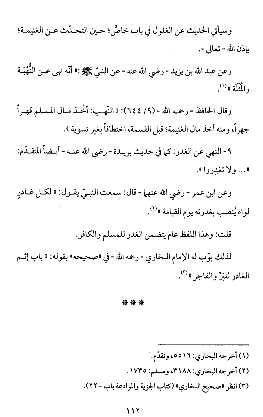 9 - النهي عن الغدر: كما في حديث بريدة -رضي الله عنه- أيضاً المتقدّم: " ... ولا تغدِروا".