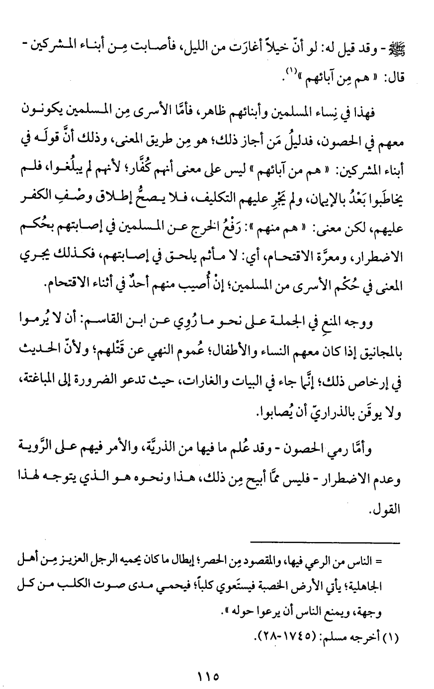 فهذا في نِساء المسلمين وأبنائهم ظاهر، فأمَّا الأسرى مِن المسلمين يكونون معهم في الحصون، فدليلُ مَن أجاز ذلك؛ هو مِن طريق المعنى، وذلك أنَّ قولَه في أبناء المشركين: "هم من آبائهم" ليس على معنى أنهم كُفَّار؛ لأنهم لم يبلُغوا، فلم يخاطَبوا بَعْدُ بالإيمان، ولم يَجْرِ عليهم التكليف، فلا يصحُّ إطلاق وصْفِ الكفر عليهم، لكن معنى: "هم منهم": رَفْعُ الخرج عن المسلمين في إصابتهم بحُكم الاضطرار، ومعرَّة الاقتحام، أي: لا مأثم يلحق في إصابتهم، فكذلك يجري المعنى في حُكْم الأسرى من المسلمين؛ إنْ أُصيب منهم أحدٌ في أثناء الاقتحام.