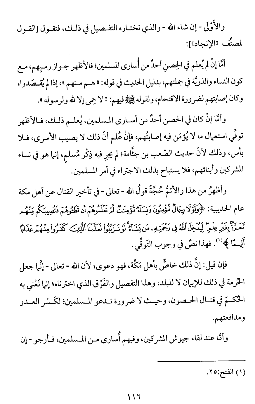 فإن قيل: إنَّ ذلك خاصٌّ بأهل مَكَّة، فهو دعوى؛ لأن الله -تعالى- إنَّما جعل الحُرمة في ذلك للإيمان لا للبلد، وهذا التفصيل والفَرْق الذي اخترناه؛ إنما نَعْني به الحُكمَ في قتال الحصون، وحيث لا ضرورة تدعو المسلمين؛ لكَسْر العدو ومدافعتهم.