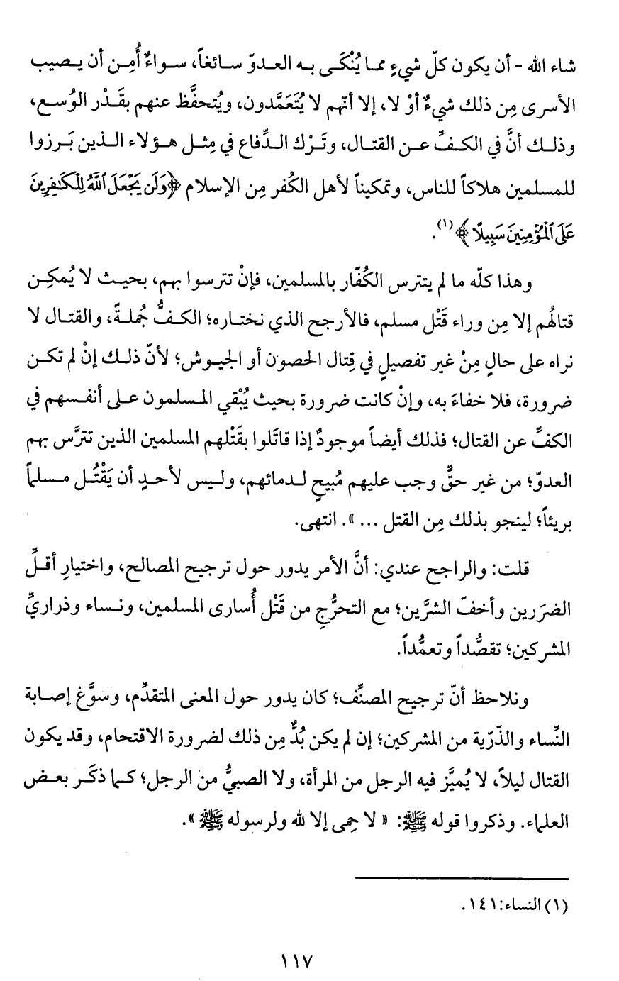 قلت: والراجح عندي: أنَّ الأمر يدور حول ترجيح المصالح، واختيارِ أقلِّ الضرَرين وأخفّ الشرَّين؛ مع التحرُّجِ من قَتْل أُسارى المسلمين، ونساء وذراريِّ المشركين؛ تقصُّداً وتعمُّداً.