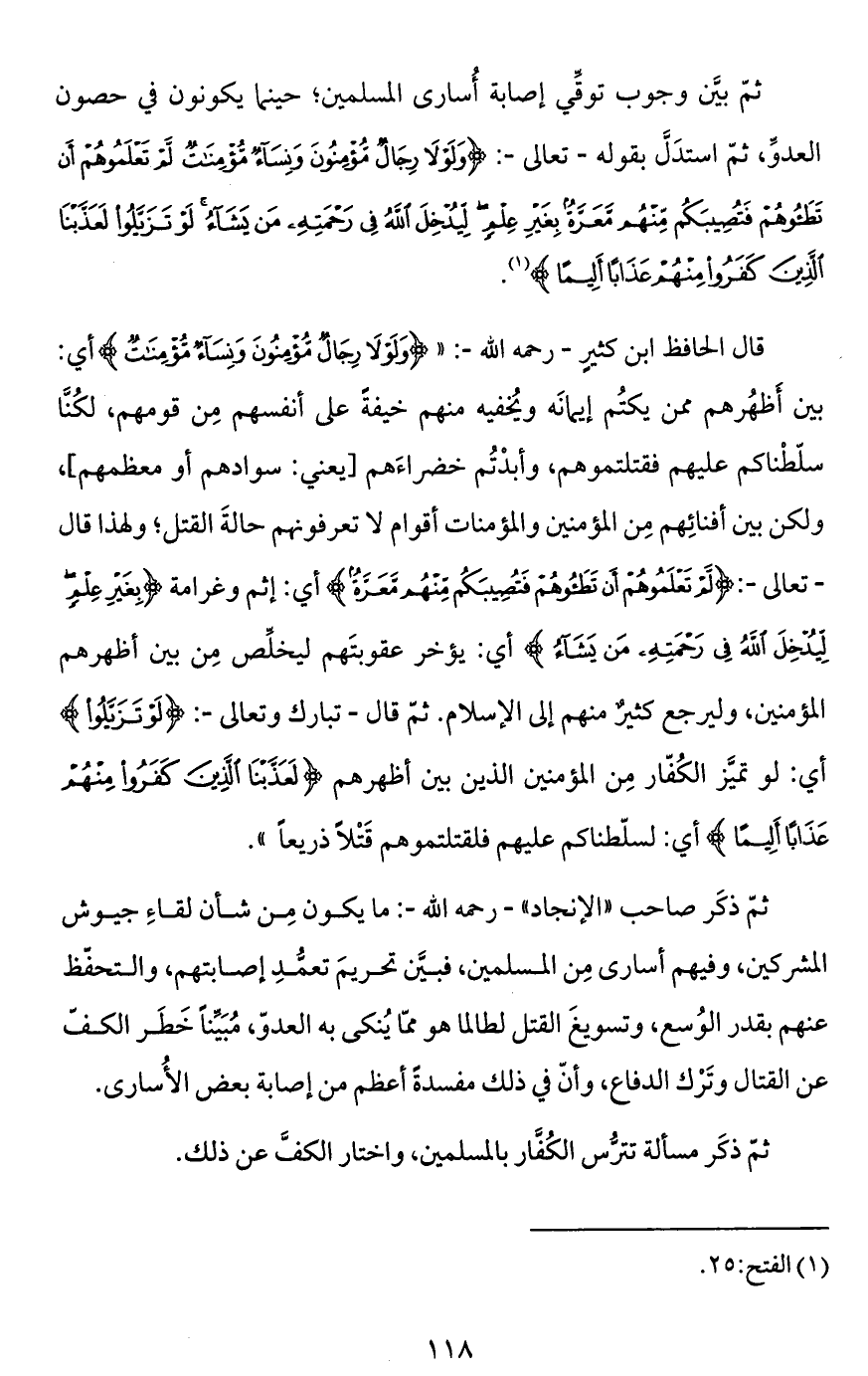 ثمّ بيَّن وجوب توقِّي إصابة أُسارى المسلمين؛ حينما يكونون في حصون العدوِّ، ثمّ استدَلَّ بقوله -تعالى-: {وَلَوْلَا رِجَالٌ مُؤْمِنُونَ وَنِسَاءٌ مُؤْمِنَاتٌ لَمْ تَعْلَمُوهُمْ أَنْ تَطَئُوهُمْ فَتُصِيبَكُمْ مِنْهُمْ مَعَرَّةٌ بِغَيْرِ عِلْمٍ لِيُدْخِلَ اللَّهُ فِي رَحْمَتِهِ مَنْ يَشَاءُ لَوْ تَزَيَّلُوا لَعَذَّبْنَا الَّذِينَ كَفَرُوا مِنْهُمْ عَذَابًا أَلِيمًا} (¬1).