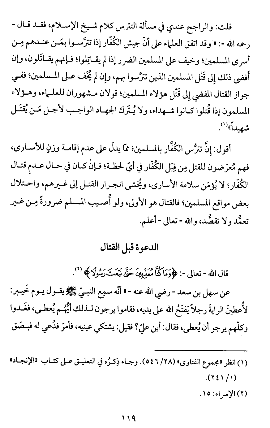 قلت: والراجح عندي في مسألة التترس كلام شيخ الإسلام، فقد قال - رحمه الله-: "وقد اتفق العلماء على أنّ جيش الكُفّار إذا تترَّسوا بمَن عندهم مِن أسرى المسلمين؛ وخيف على المسلمين الضرر إذا لم يقاتِلوا؛ فإنهم يقاتَلون، وإن أَفضى ذلك إِلى قَتْل المسلمين الذين تترَّسوا بهم، وإِن لم يُخَف على المسلمين؛ ففي جواز القتال المفضي إِلى قَتْل هؤلاء المسلمين؛ قولان مشهوران للعلماء، وهؤلاء المسلمون إذا قُتلوا كانوا شهداء، ولا يُتَرك الجهاد الواجب لأجل مَن يُقتَل شهيداً" (¬1).