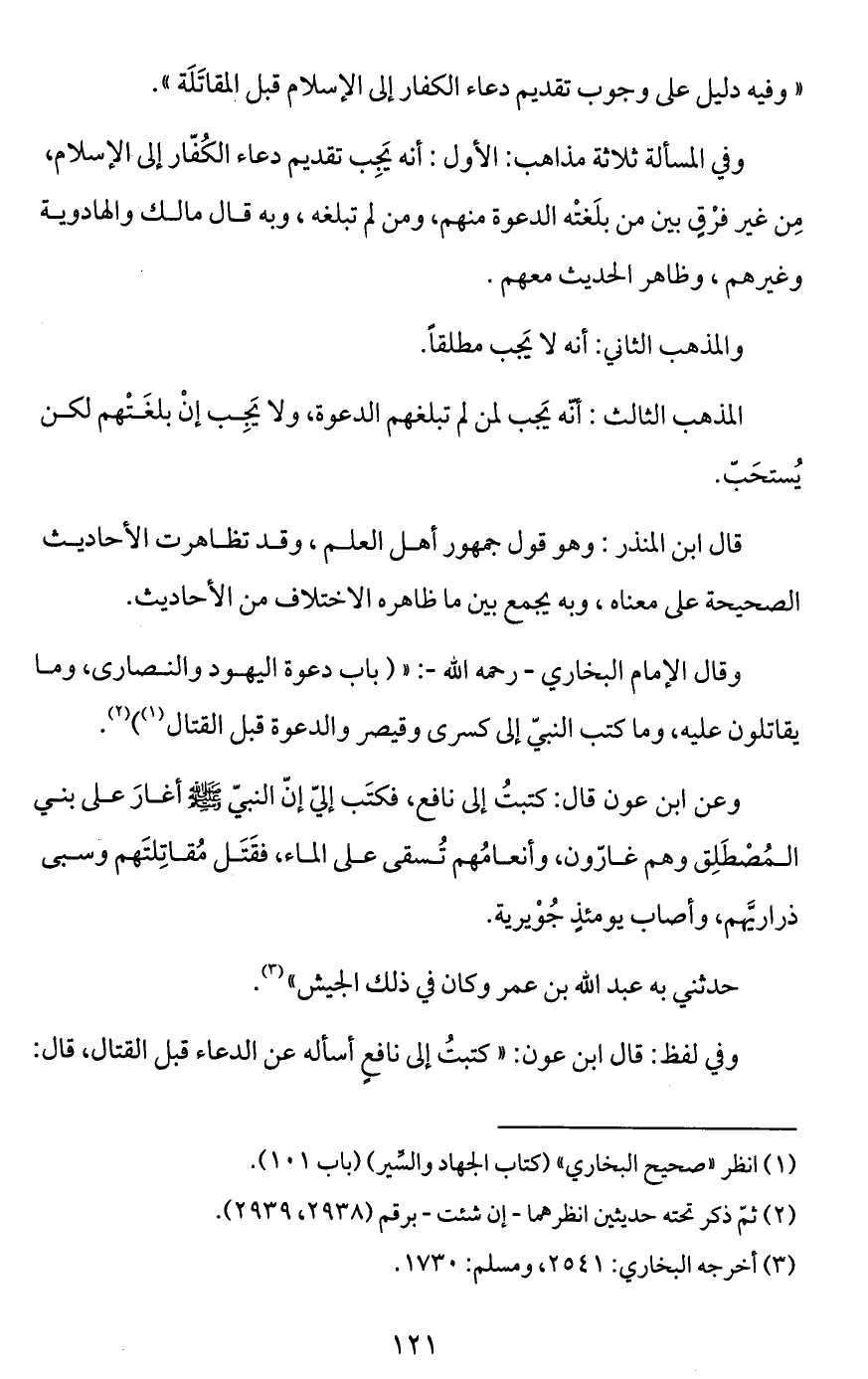وفي المسألة ثلاثة مذاهب: الأول: أنّه يَجِب تقديم دعاء الكُفّار إلى الإسلام، مِن غير فرْقٍ بين من بلَغتْه الدعوة منهم، ومن لم تبلغه، وبه قال مالك والهادوية وغيرهم، وظاهر الحديث معهم.